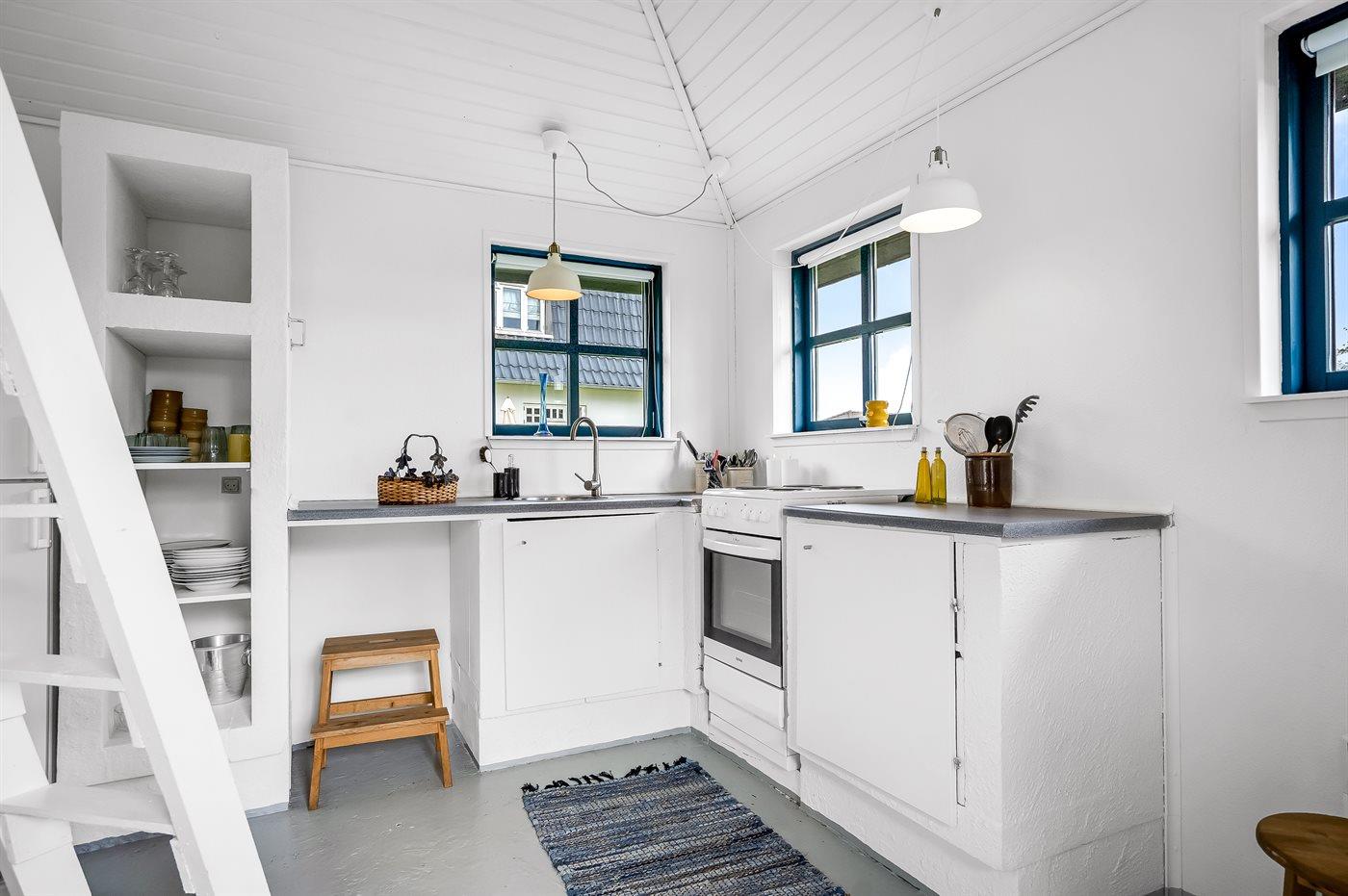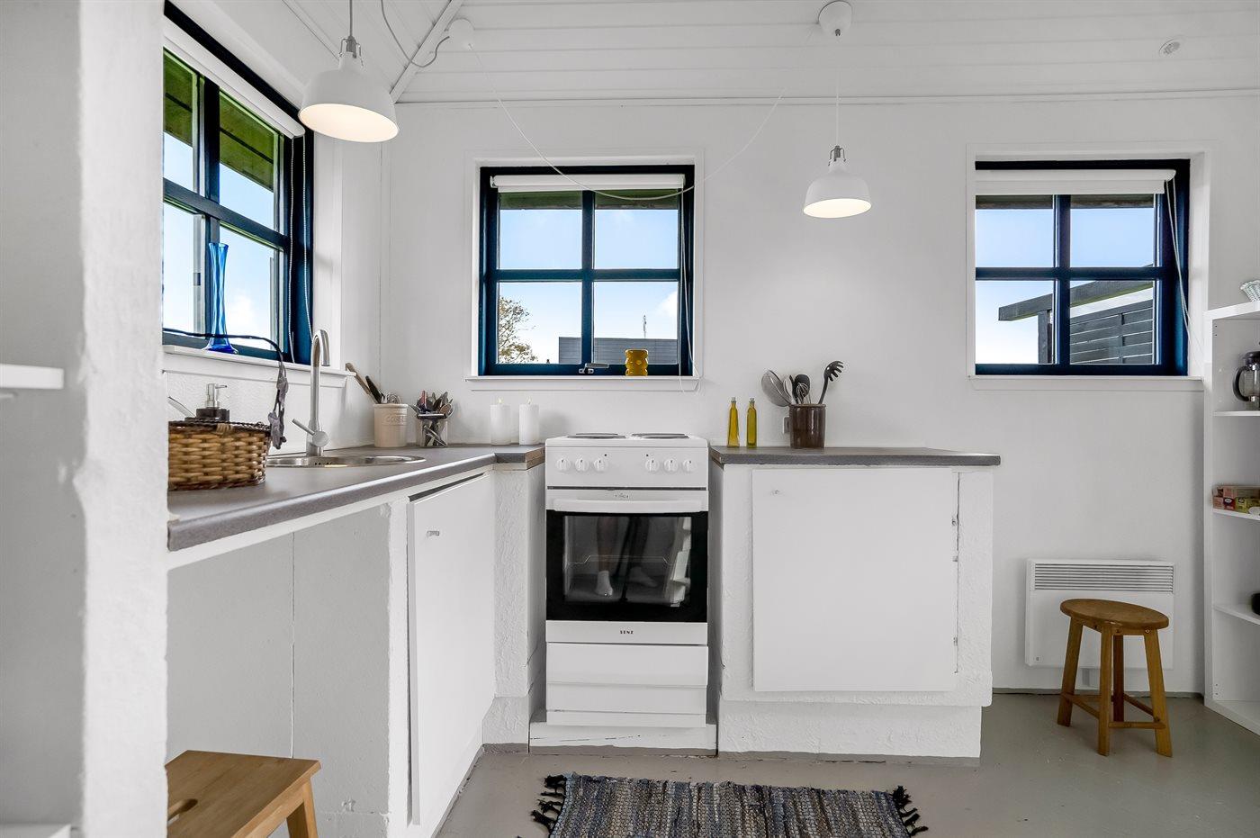 Køkkenet er udstyret med 1 køleskab. Der er 4 elkogeplader, varmluftovn.