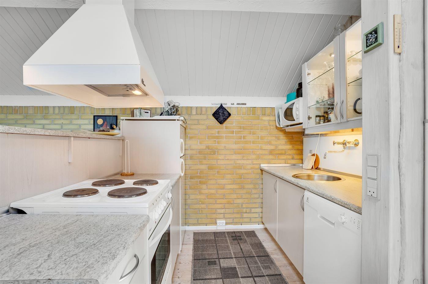 Køkkenet er udstyret med 1 køleskab. Der er 4 elkogeplader, varmluftovn, mikrobølgeovn samt opvaskemaskine.