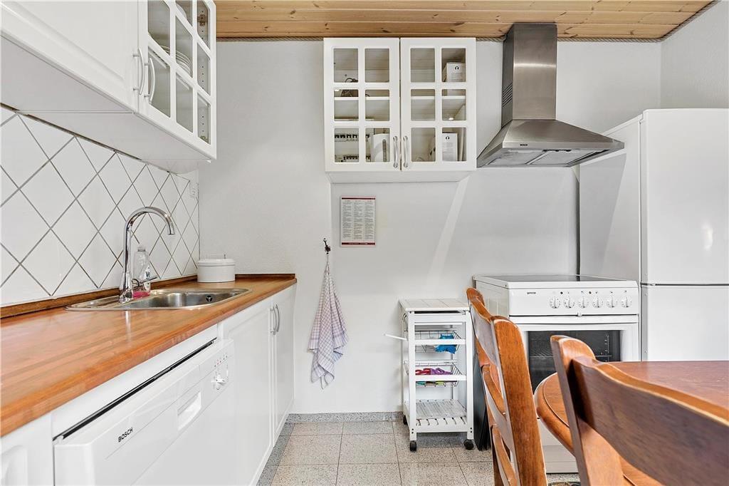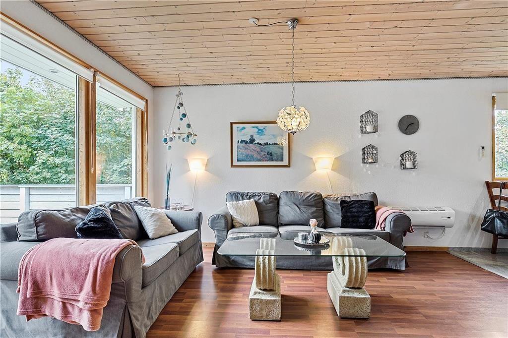 I det velindrettede feriehus kan du nemt servere kaffen og morgenbrødet direkte fra køkkenbordet til spisebordet. Her kan I sidde og kikke ud i haven og planlægge dagens fornøjelser og aktiviteter. Om aftenen frister afslapning i sofaen tæt på brændeovnen og med kik ud til haven fra de store terrassevinduer. Måske har du bagt en kage som kan nydes til kaffen, mens dagens oplevelser synker ind.
