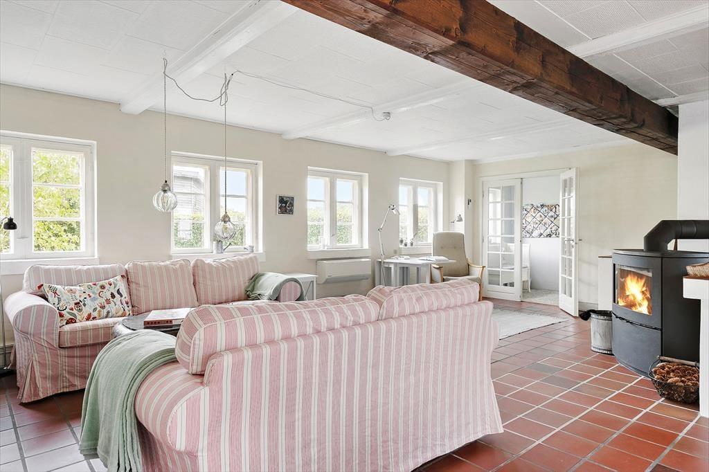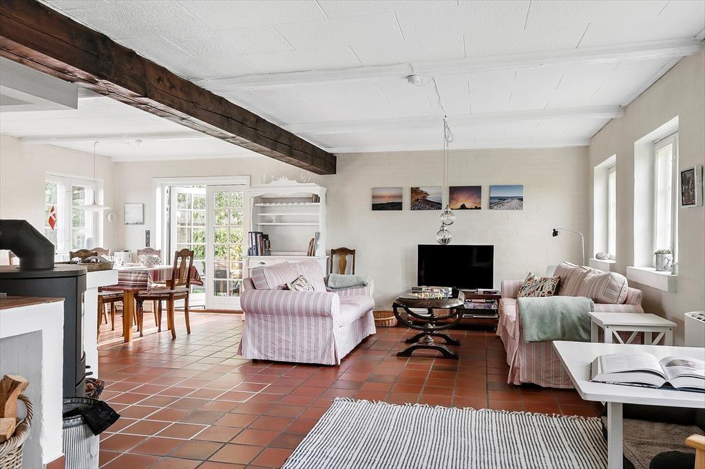Rigtig hyggeligt feriehus i 2 etager med plads til 6 personer. Huset indeholder i stueetagen et hyggeligt landkøkken i åben forbindelse med spiseplads og opholdsstue med brændeovn, energibesparende varmepumpe samt udgang til terrassen. Herudover er der et dejligt badeværelse med gulvvarme og vaskemaskine, et viktualierum samt et soveværelse med dobbeltseng. Førstesalen er indrettet med en repos med endnu en energibesparende varmepumpe, endnu et badeværelse med toilet og bruser samt 2 store soveværelser.