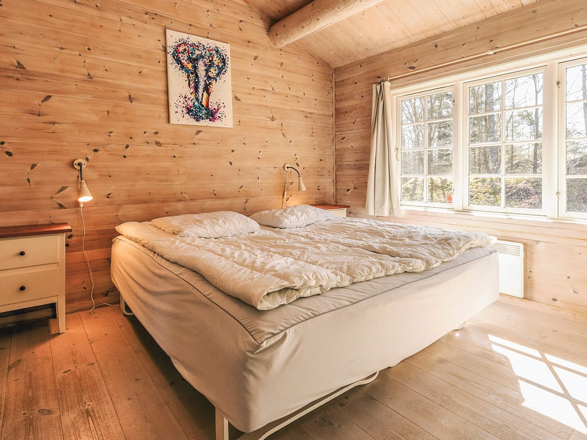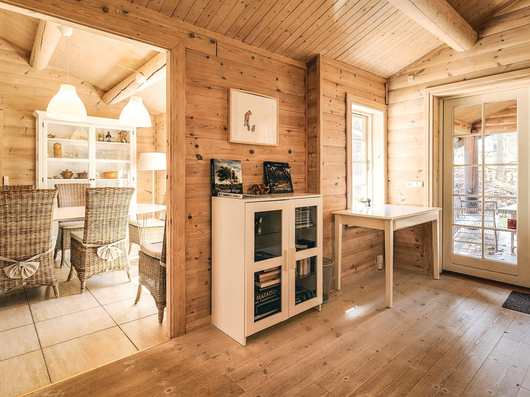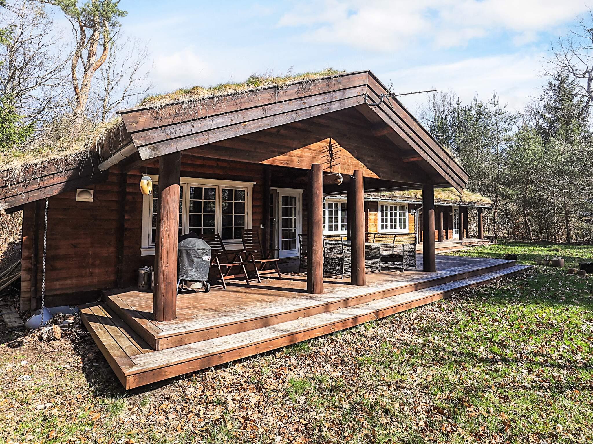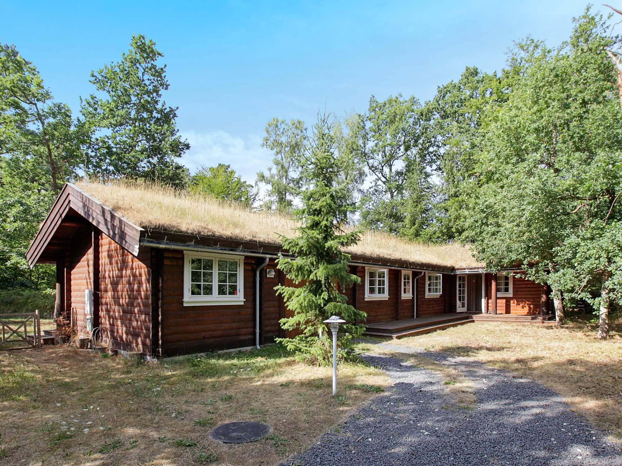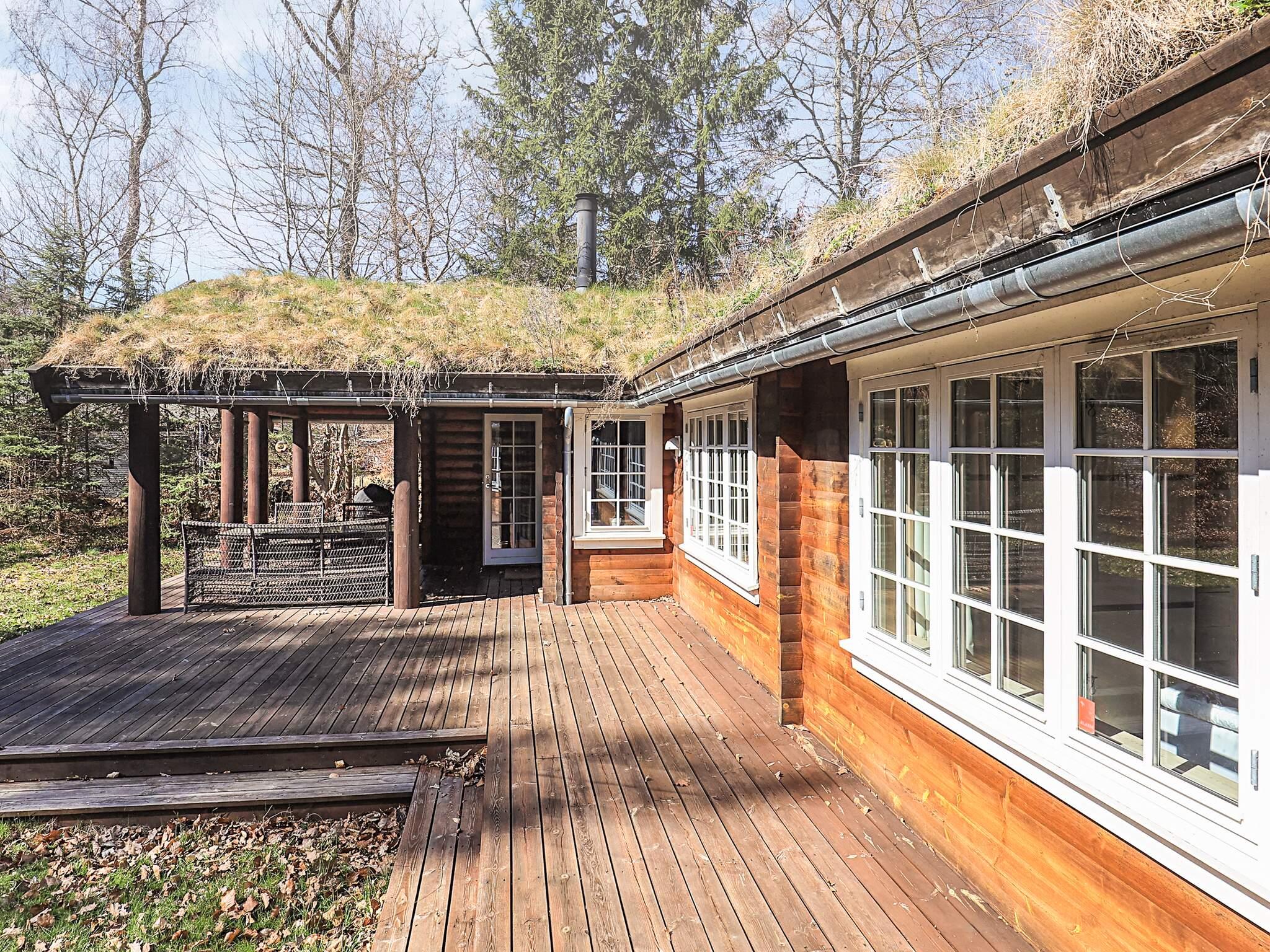 Afskærmet af store træer ligger dette sommerhus ved Tisvildeleje opført i træ og med græs på taget. Hele sommerhuset er opført i lyse træmaterialer med frilagte bjælker og loft til kip. Her er tre soveværelser, bryggers med vaskefaciliteter, to badeværelser med muret bruseniche samt et moderne køkken med to ovne, som gør det muligt at lave mad til mange. I stuen er der gode plads til hygge og fælles aktiviteter i sofaen omkring brændeovnen. Udlejes ikke til ungdomsgrupper.