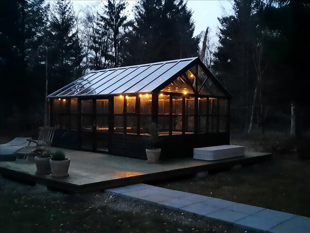 Udendørsområdet er en sand perle. Den store terrasse, delvist overdækket, inviterer til hyggelige grillaftener og afslapning i solen. I haven finder du et charmerende orangeri, hvor loungemøbler og varmelamper gør det til det perfekte sted at nyde en kop kaffe eller en stille aftenstund, uanset vejret.