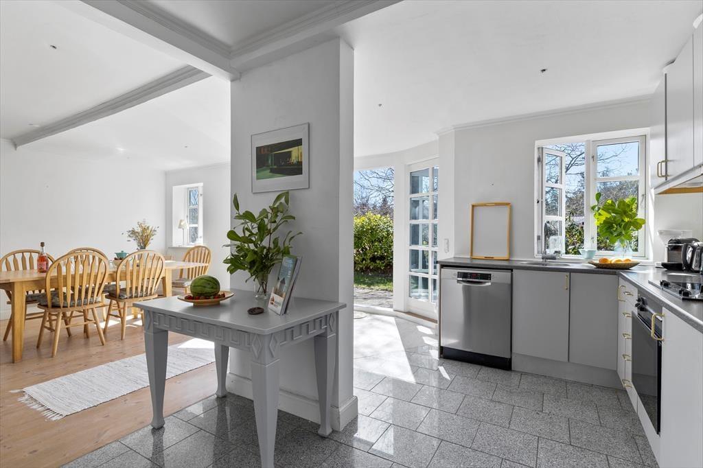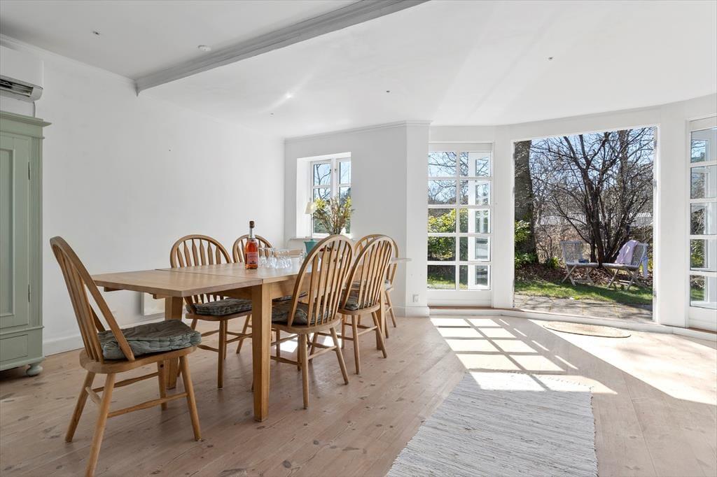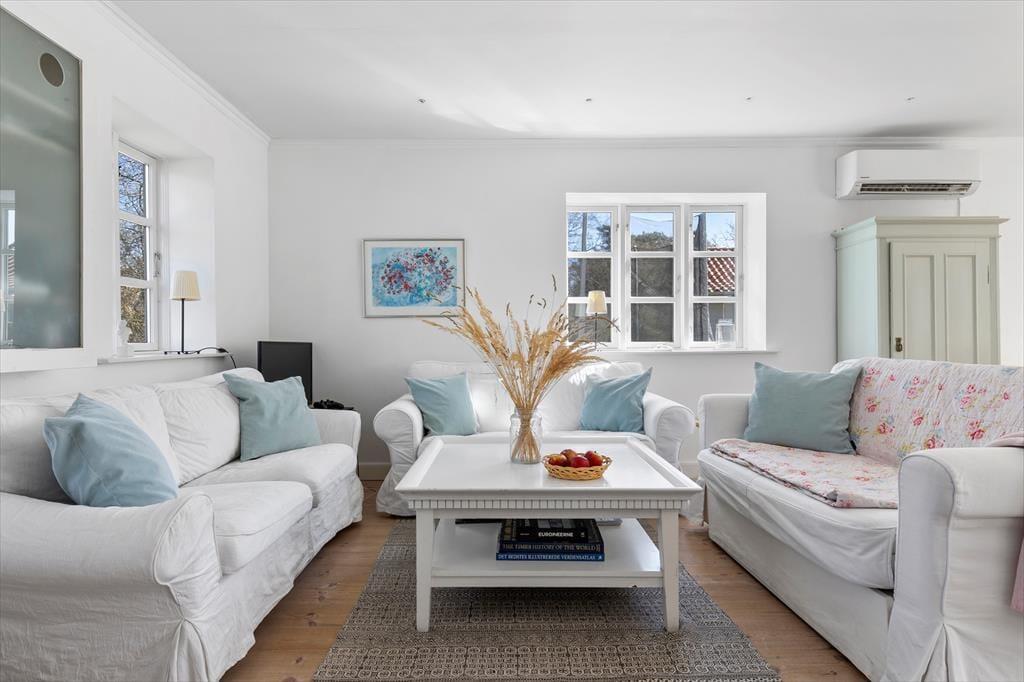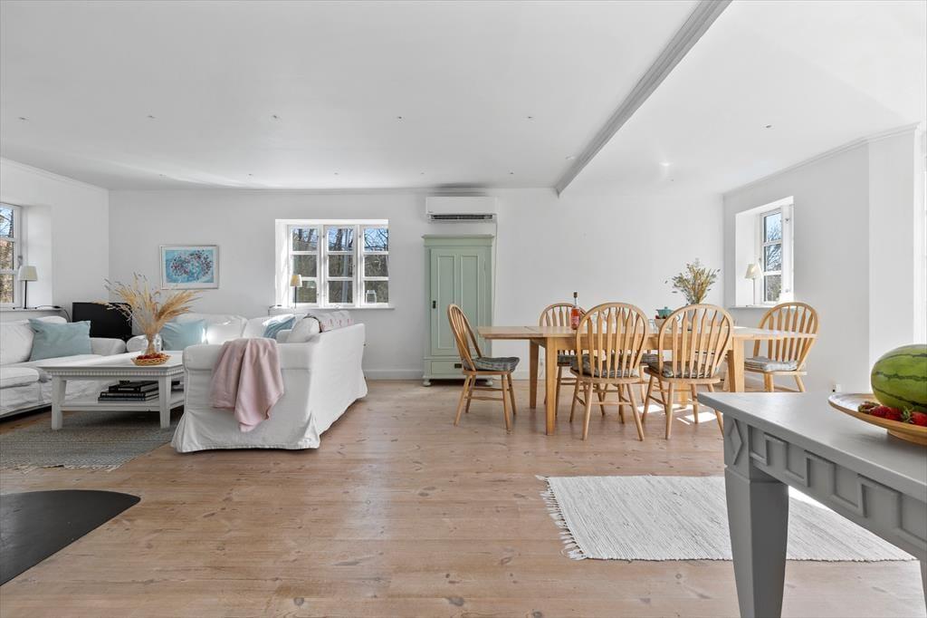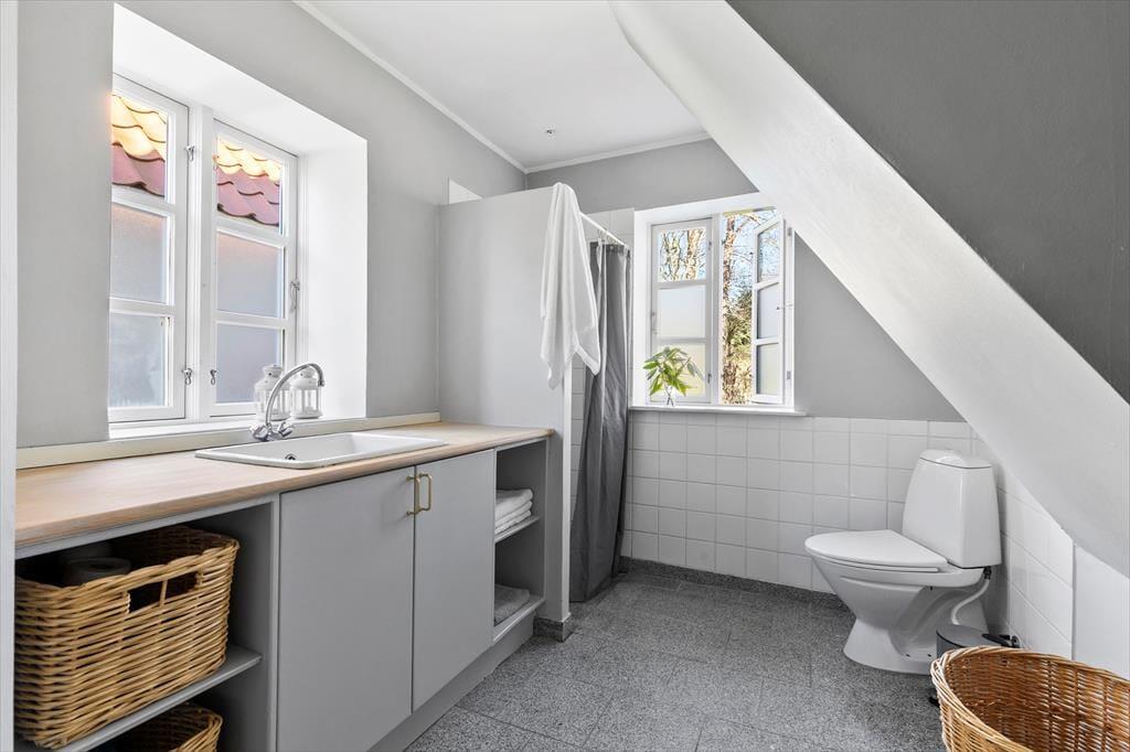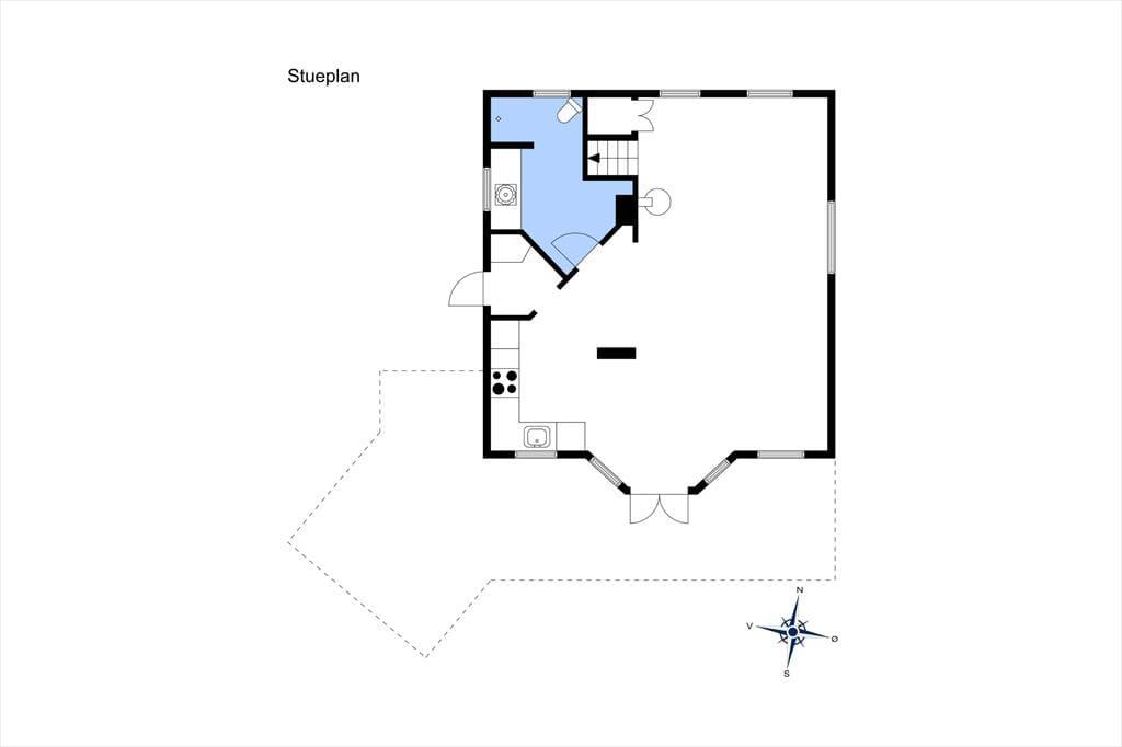 Entre. Stort åbent køkken-alrum med køkken, spiseplads og siddegruppe. Direkte udgang til terrassen. Badeværelse med brusebad. Der er trappe fra stuen til 1. sal