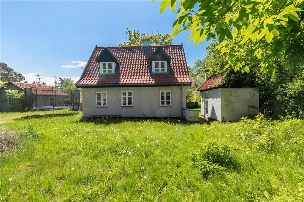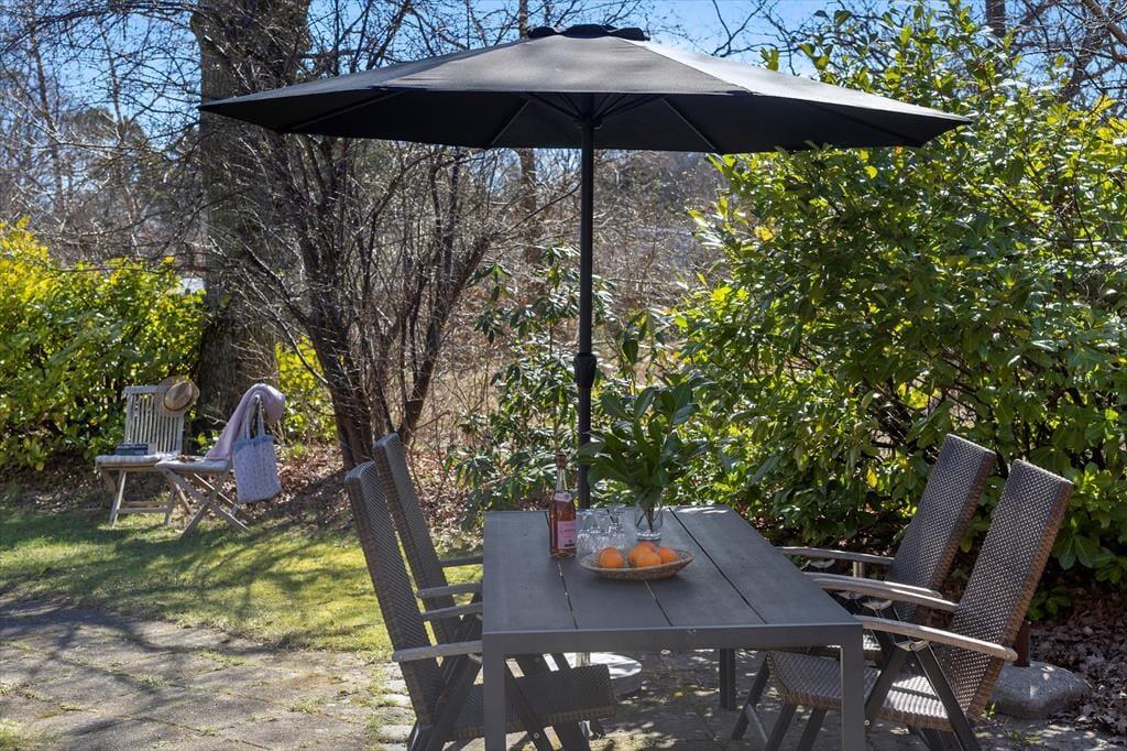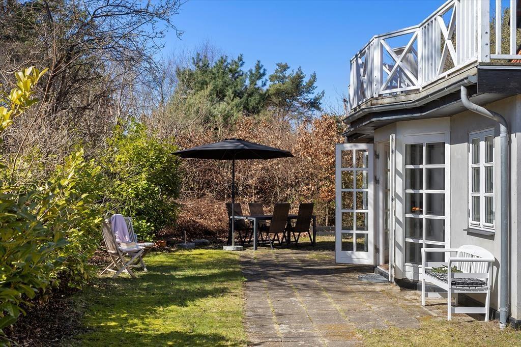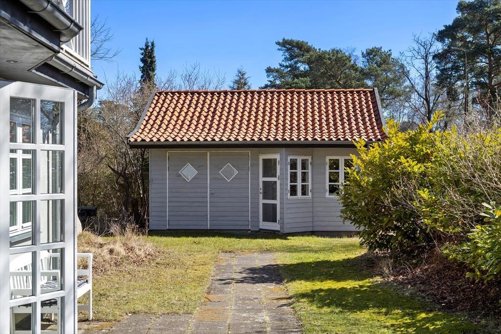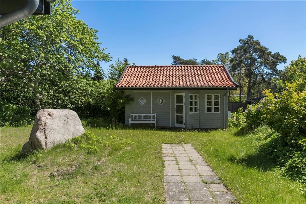Sommerhuset ligger på en delvist lukket uplejet naturgrund med græs, buske og træer. Terrassen er beliggende på forsiden af huset. Der er også trampolin i forhaven.