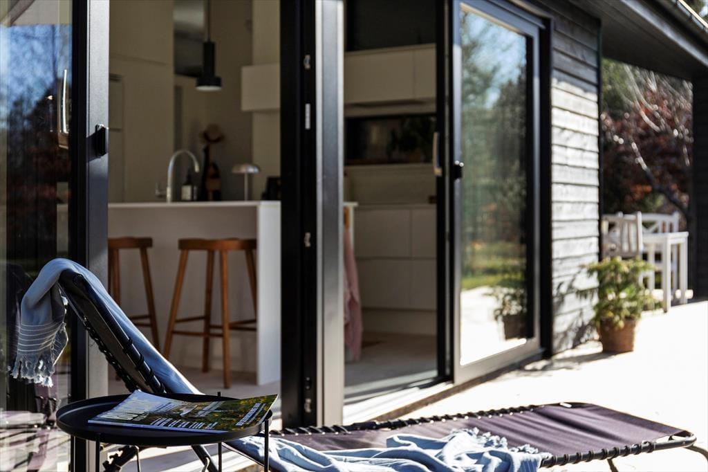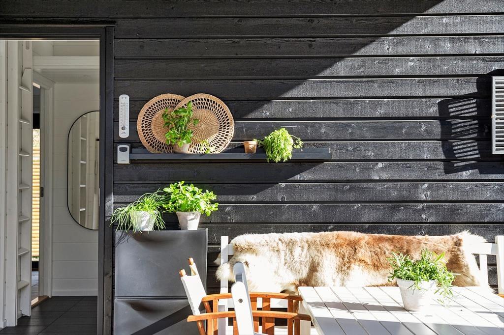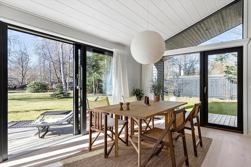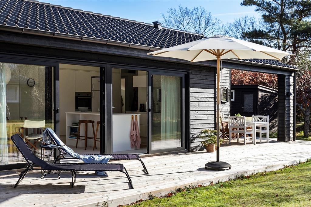 Udenfor venter en solrig og velanlagt have, hvor sommerlivet leves under åben himmel. Den store træterrasse indbyder til afslapning i solen, grillmiddage med familien og morgenkaffe i det fri. Her er plads til både leg og fordybelse – hvad enten du vil nyde en stille stund med en bog eller samles med dine kære om et godt måltid.