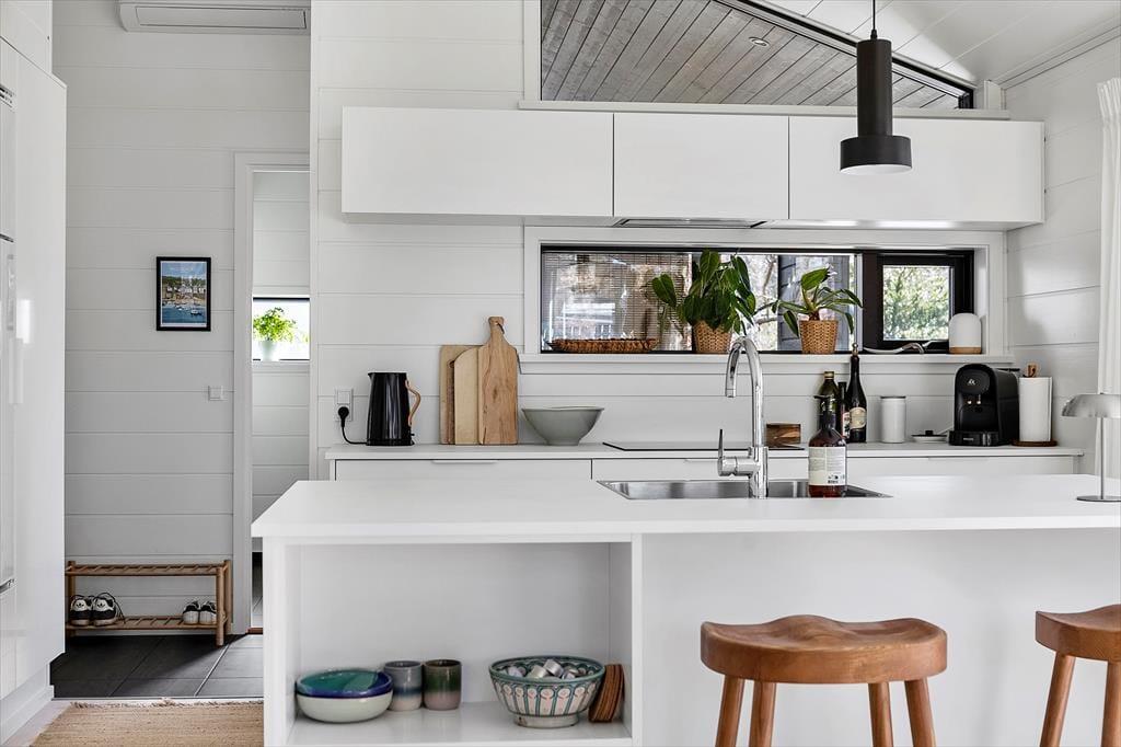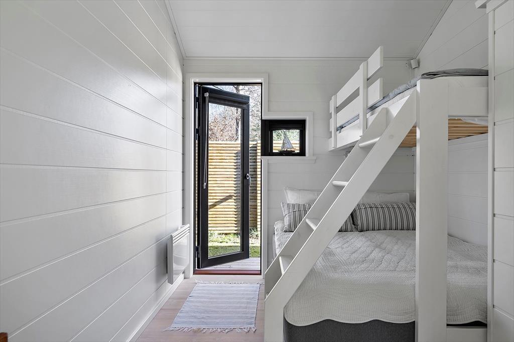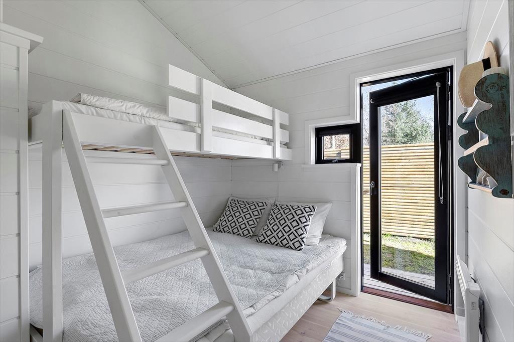 Det åbne køkken og stueområde skaber en naturlig samlingsplads for hyggelige middage, brætspil eller bare afslappet samvær med udsigt til haven. Indretningen balancerer perfekt mellem nordisk enkelthed og personlig varme, og de gode detaljer går igen i hele huset. Her kan man virkelig mærke, at der er skabt et sted til ferie – med ro, komfort og nærvær i fokus.