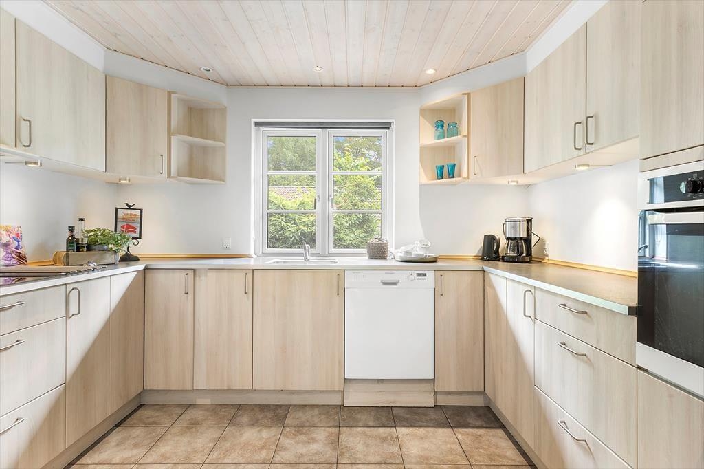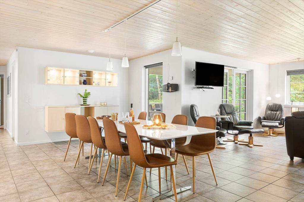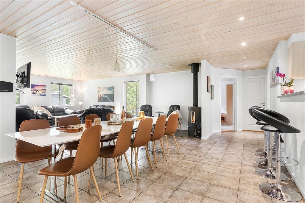 Køkkenet er fuldt udstyret med alt, hvad du behøver for at tilberede lækre måltider. Mens du kokkererer, kan familien sidde ved baren og deltage i samtalerne i køkkenet. De færdige måltider kan nydes sammen om det lange spisebord, hvor der er plads til alle.