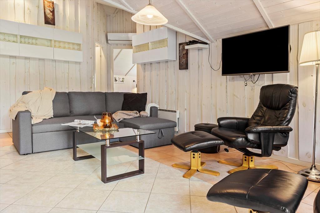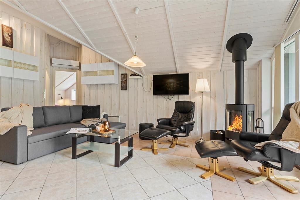 Opholdsstuen er udstyret med bløde møbler, der indbyder til hyggelige aftener med brætspil og film for hele familien. Her kan I samles foran brændeovnen og nyde den varme og indbydende atmosfære på kølige aftener. Stuen har også to tv, et i sofahjørnet og et ved spisebordet, så man kan følge med i landkampen eller andet, uden at gå glip af de hyggelige måltider med familien.