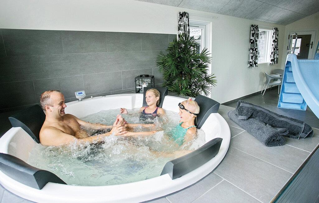 I husets store poolafdeling er der en lun 18 m2 stor pool med vandrutchebane og svømmetræner. Den romerske trappe sikrer at alle aldre let kan komme i og op af poolen. Efter en dejlig svømmetur er der mulighed for en tur i husets 6-personers spabad eller en tur i saunaen, her findes desuden også et separat badeværelse. Adgang til poolrummet er sikret med to håndtag, således at husets yngste gæster ikke kan komme alene i rummet. Udendørs er der også rig mulighed for aktiviteter. Her er gynger, legetårn med rutsjebane, sandkasse og trampolin (benyttes på eget ansvar). Terrassen er veludstyret med lækre havemøbler til alle, solsenge og en grill. En del af terrassen er overdækket.
