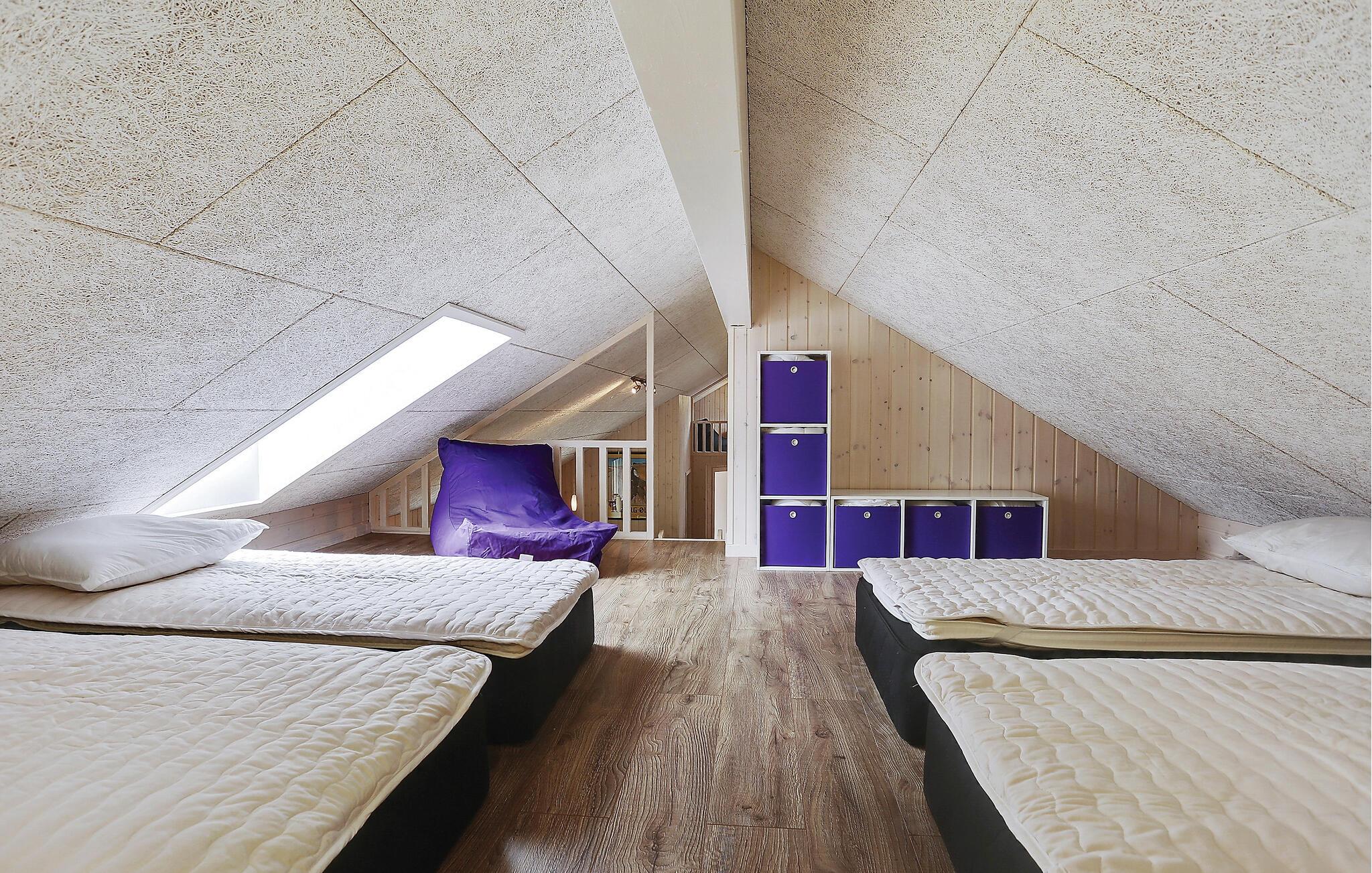 Arkitekttegnet luksushus opført i de bedste materialer. Huset har otte gode soveværelser i tre sektioner, hver sektion med separat badeværelse. Dette giver luft og plads at nyde ferien flere familier sammen. Centralt i huset findes et stor åbent køkken/alrum med et lækkert køkken, skabt til at tilberede maden til husets mange gæster. I alrummet er der brændeovn, en hyggelig sofagruppe og tv med tilhørende stor tv-pakke. I husets aktivitetsrum er der rig mulighed for aktiviteter for alle aldre. Her er både pool/billard, bordfodbold, dart, bordtennis, bar med køleskab og en sofagruppe med tv og Playstation4. Her er også aktiviteter for de yngste på to hemse. Den ene med sovepladser, den anden med sækkestole, legetøj og tv med DVD. Begge hemse har tre sovepladser. Der er musikanlæg i alle husets rum.