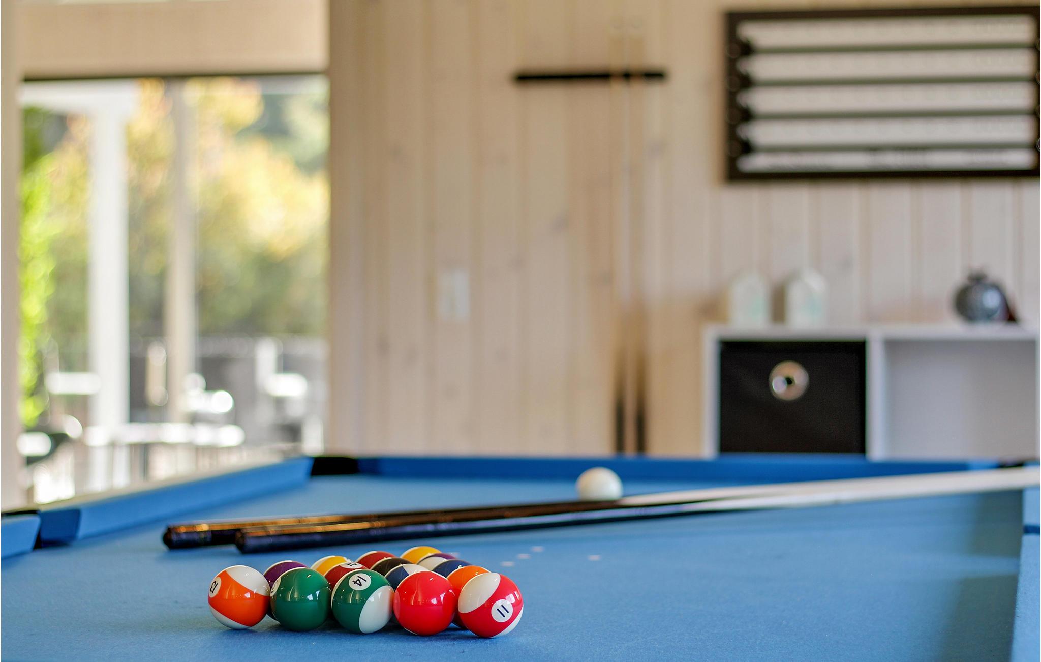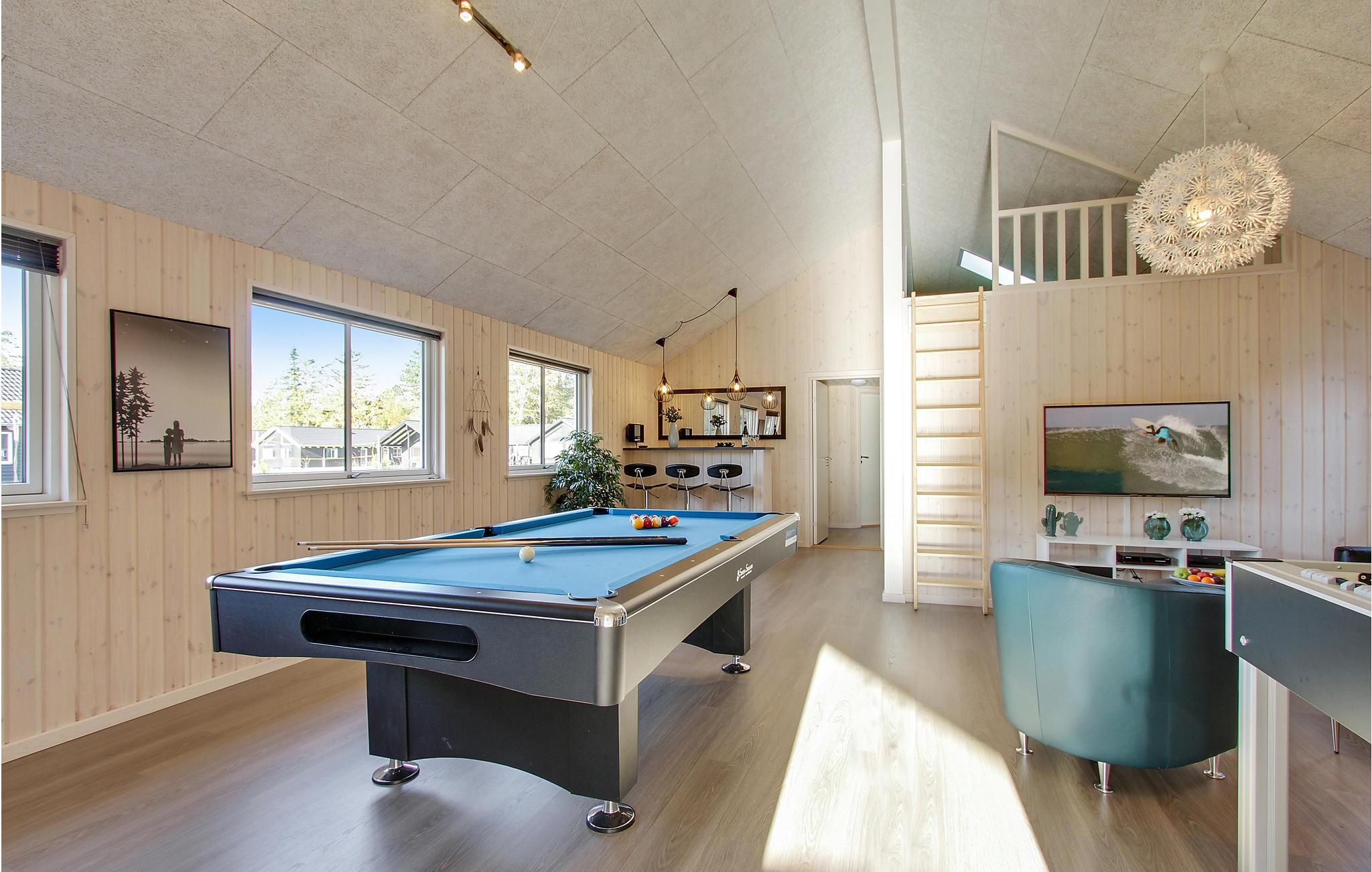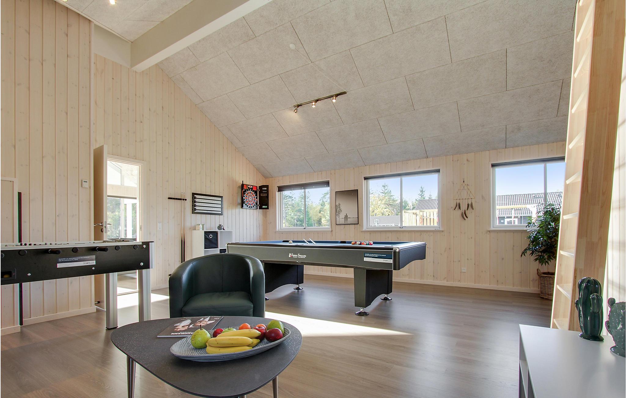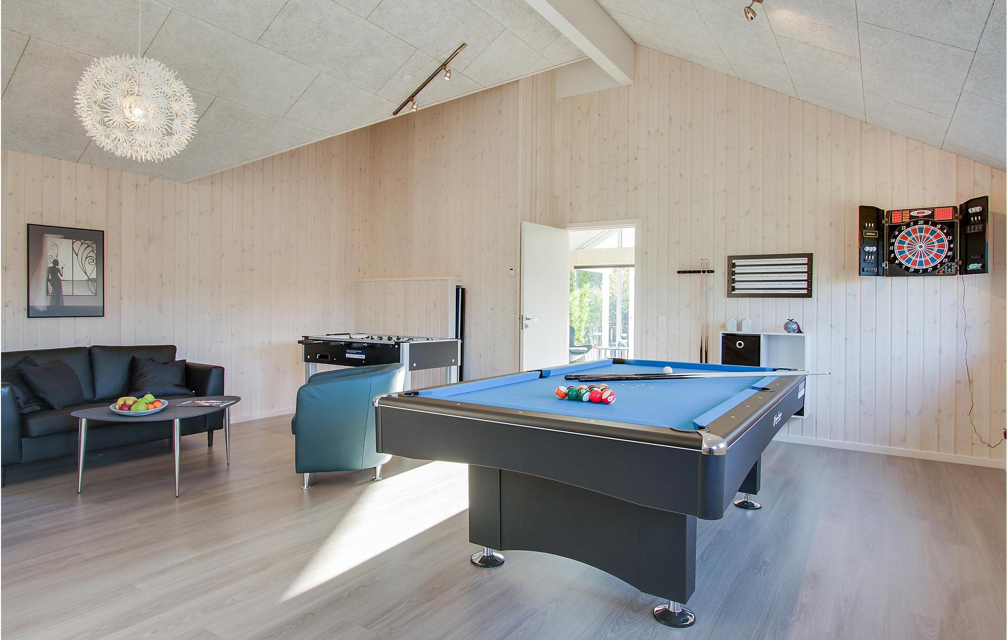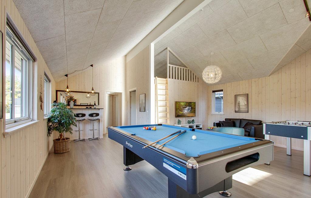 Flot sommerhus med pool, sauna og aktivitetsrum i naturskønne omgivelser nær badestrand.