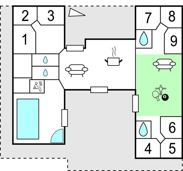 Dette rummelige feriehus, udstyret med adskillige ekstrafunktioner, er ideelt til familiesammenkomster eller ferier med klubben. Glæd jer til at lave mad sammen i det moderne køkken og nyde hyggelige måltider ved det lange spisebord. Lær børnene at svømme i den varme indendørs pool, forkæl jer selv med afslappende stunder i spabadet, spil bordtennis, bordfodbold, billard eller PlayStation i aktivitetsrummet eller stream en god film i den rummelige stue.
