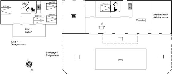 Bemærk desuden at det ene værelse på 1. salen indeholder 2 dobbeltsenge og, at to af sovepladserne er på sovesofa i stuen på 1. salen.