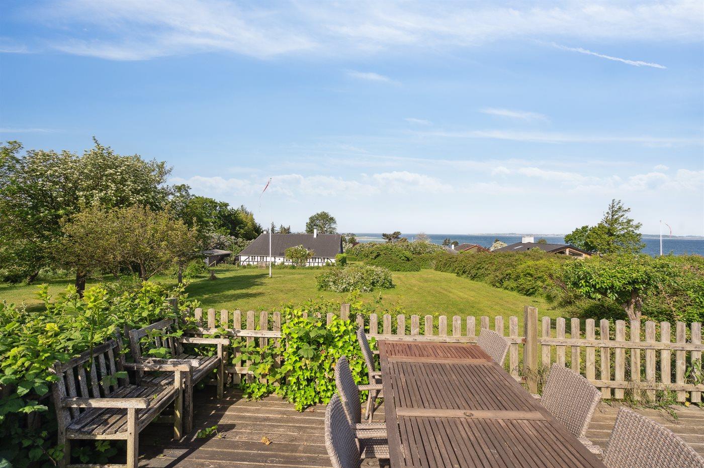 For enden af den store grund er der anlagt et lille gæstehus med en stor hævet træterrasse, hvorfra der er udsigt ud over Helnæs Bugt.
