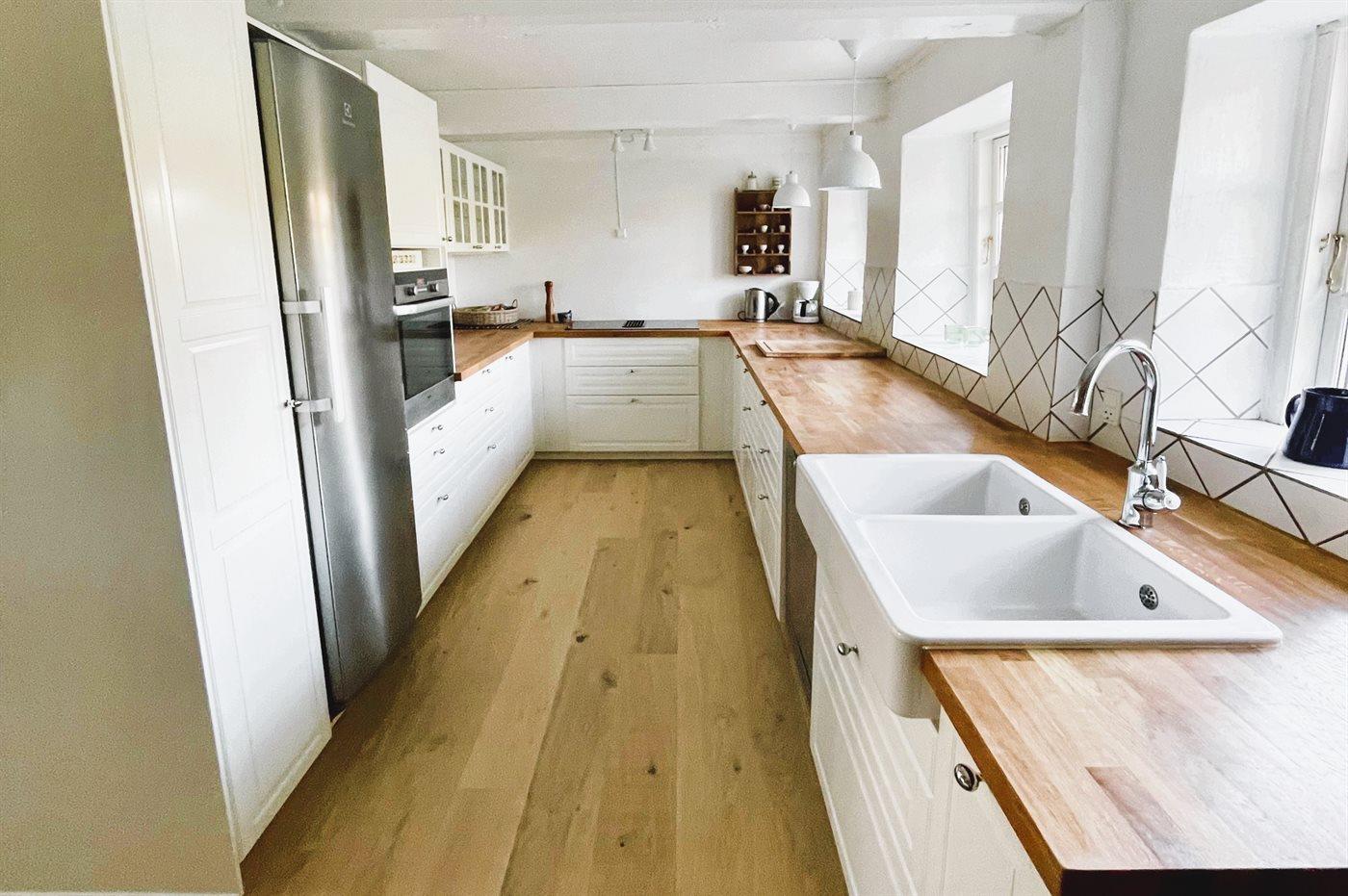Køkkenet er udstyret med 1 køleskab. Der er 4 induktionskogeplader, varmluftovn, mikrobølgeovn samt opvaskemaskine.