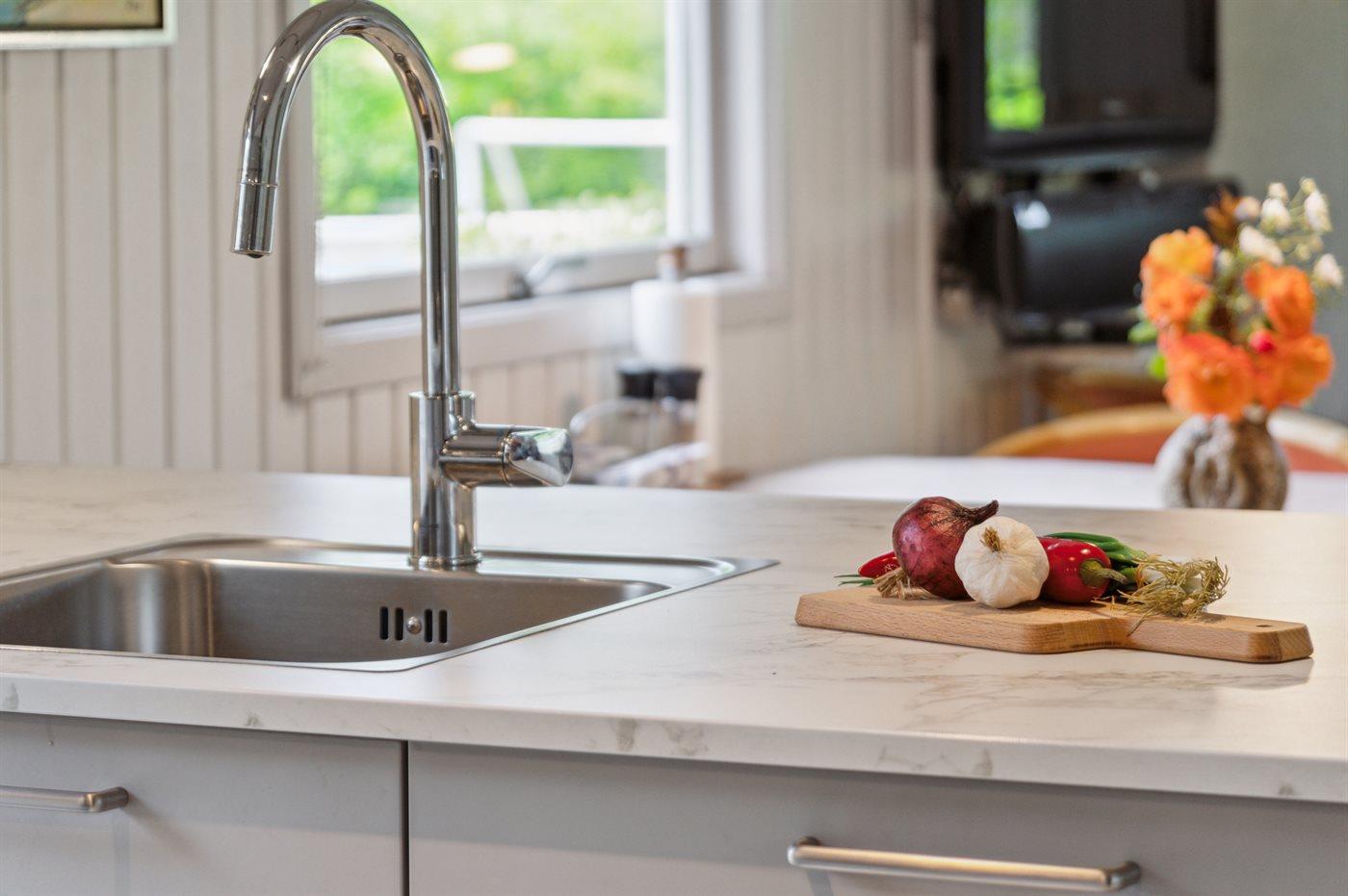 Køkkenet er udstyret med 1 køleskab. Der er 4 keramiske kogeplader, varmluftovn, mikrobølgeovn samt opvaskemaskine.