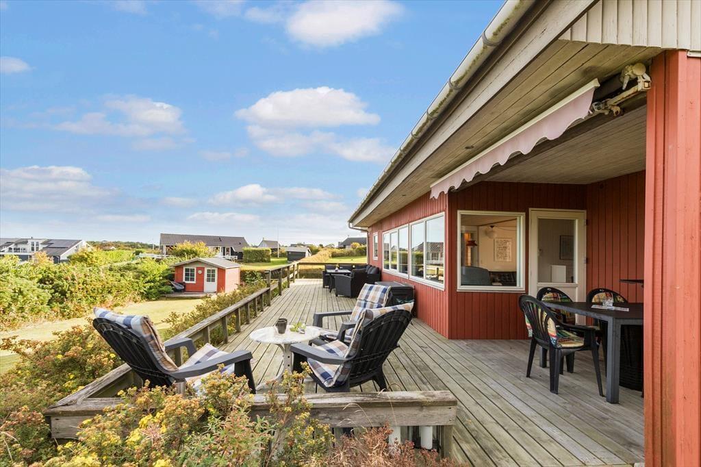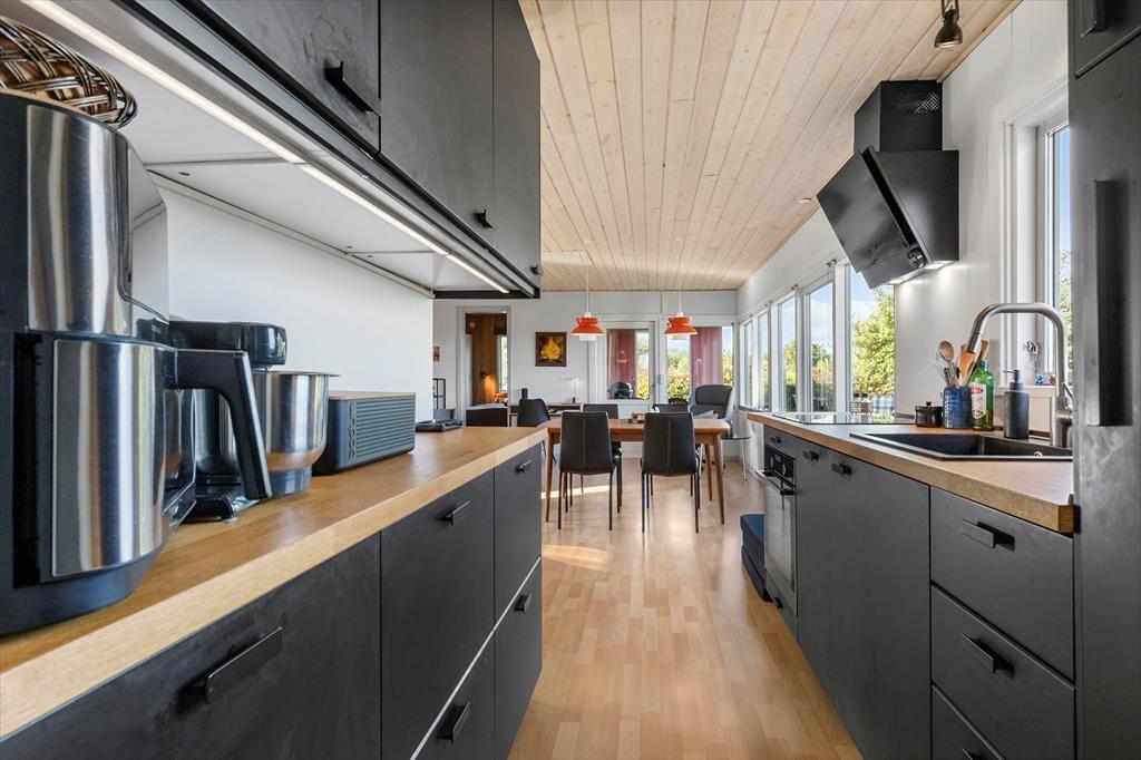 Stuen og alrummet smelter sammen med køkkenet, så I hele tiden er tæt på hinanden – og fra alle tre rum kan I følge med i havets skiftende stemninger. Entréen byder på en hyggelig kaffebar og god plads til at lande, når I kommer hjem fra strandture eller små udflugter.