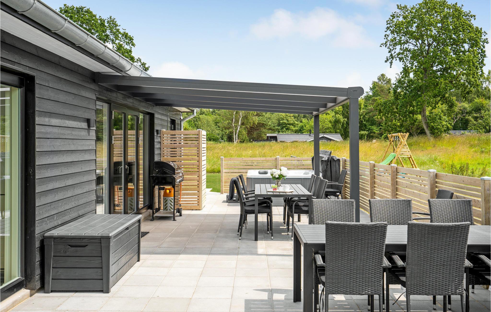 Glæd jer også til at tilbringe mange afslappende timer i det fine udendørsområdet. Den store terrasse byder på flere siddepladser og kroge med mulighed for både sol og skygge. Sæt jer til rette med en kop friskbrygget kaffe i havemøblerne, mens børnene boltrer sig på grunden. Nyd godt af udebruseren efter en badetur, eller når I trænger til en afkøling på særligt varme dage. Efter en oplevelsesrig feriedag kan I slappe af i udespaen og lade indtrykkene sætte sig, mens aftenen sænker sig.