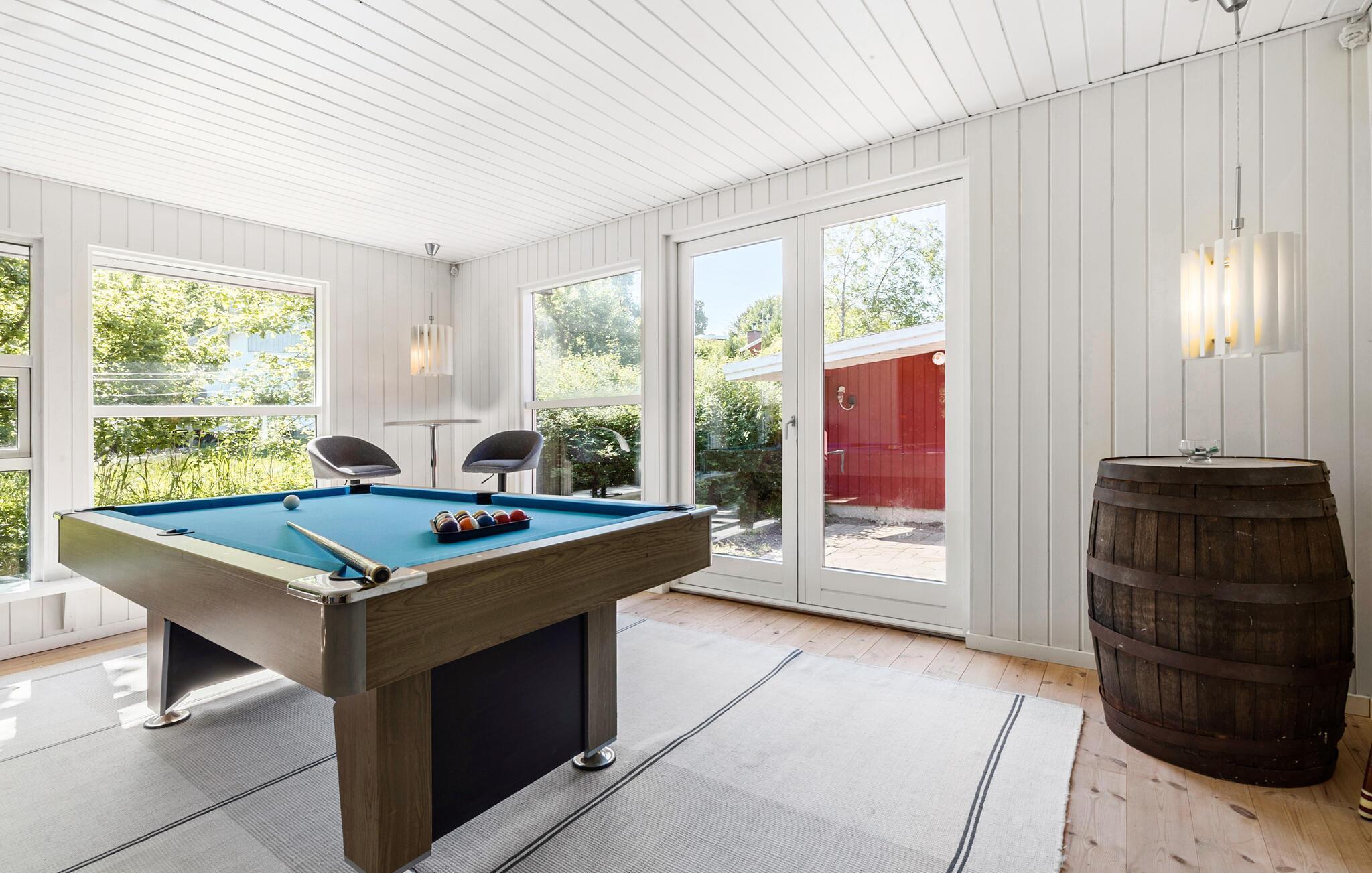 Dette rummelige sommerhus er lyst og hyggeligt, perfekt til en afslappende ferie, selv med en større gruppe. Fremstil lækre retter med friske råvarer fra gårdbutikken, og nyd jeres måltider med udsigt over det omkringliggende landskab. Udfordr jer selv ved poolbordet eller bordfodbolden, og lyt til den knitrende brændeovn under en hyggelig spilleaften.