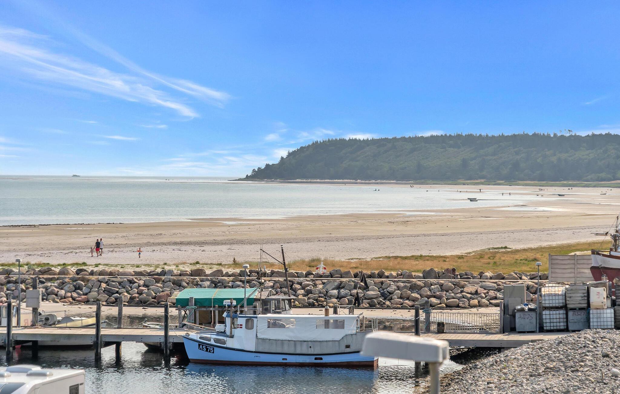 Stilfuldt sommerhus ved havnen i Bønnerup Strand med terrasse og panoramaudsigt over vandet.