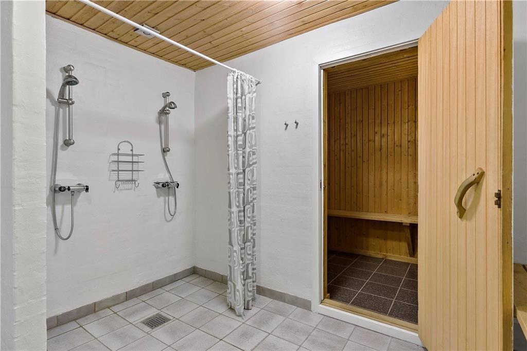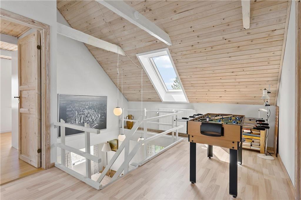 Intet mindre end 385 m2 er fordelt på sommerhusets to etager, og både oppe og nede præsenterer rummene sig på lys og indbydende vis. Takket være de mange kvadratmeter og den formfuldendte indretning kan I nemt invitere et stort selskab med på ferien. Planløsningen byder blandt andet på fem soveværelser og hele tre badeværelser, så 11 personer kan uden problemer samles til dasedage i roligt tempo. Opholdsrum finder I også flere af inden døre: På førstesalen ligger et gennemgangsrum med bordfodbold, mens stueetagen rummer en stor opholdsstue og en ditto spisestue med åben forbindelse til et velindrettet køkken. Det er naturligvis også oplagt at samles i sommerhusets poolafdeling, hvor I kan gå i sauna og plaske i swimmingpoolen, der har målene 7 x 4 x 1,30 meter.