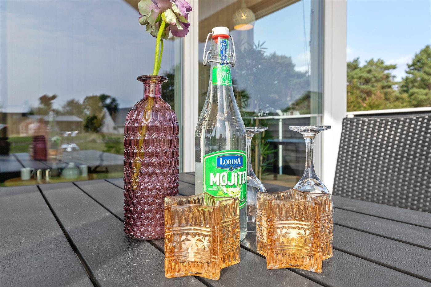 Ferieboligen er beliggende på en 1200 m² stor naturgrund. Der er 260 m til havet. Nærmeste forretning er beliggende i en afstand af 1000 m. Der er en golfbane i en afstand af 7000 m. Til ferieboligen hører 80 m² terrasseareal. Desuden er der 15 m² overdækket terrasse. Udendørs bruser. Grill til rådighed. Der er carport til rådighed. Der er installeret stik til opladning af elbil. Parkering ved ferieboligen.
