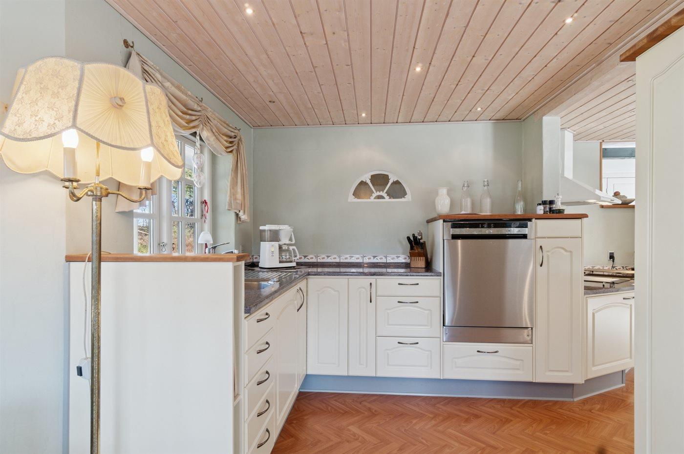 Køkkenet er udstyret med 1 køleskab. Der er 4 keramiske kogeplader, varmluftovn samt opvaskemaskine Der er gulvvarme i køkkenet.