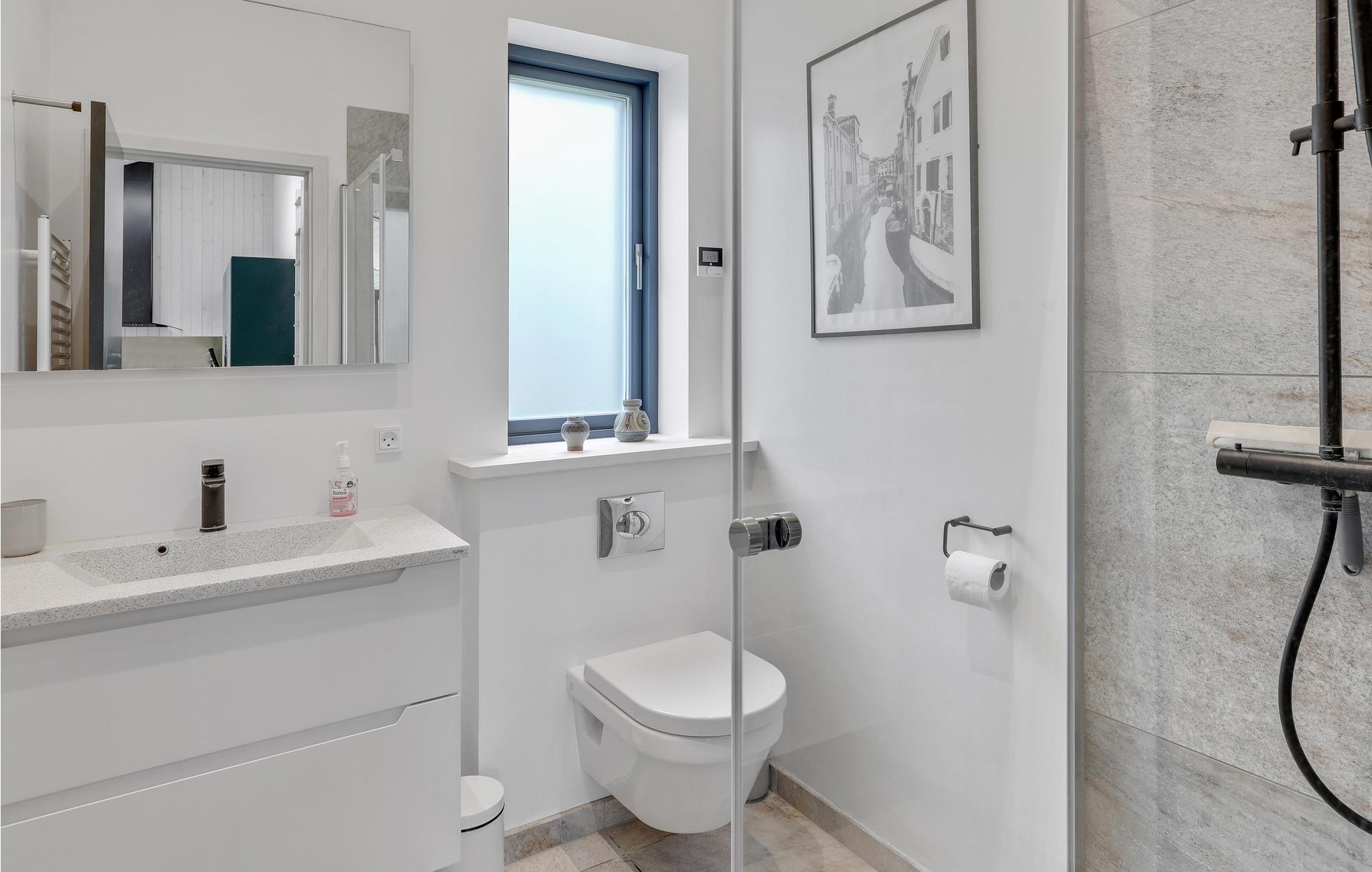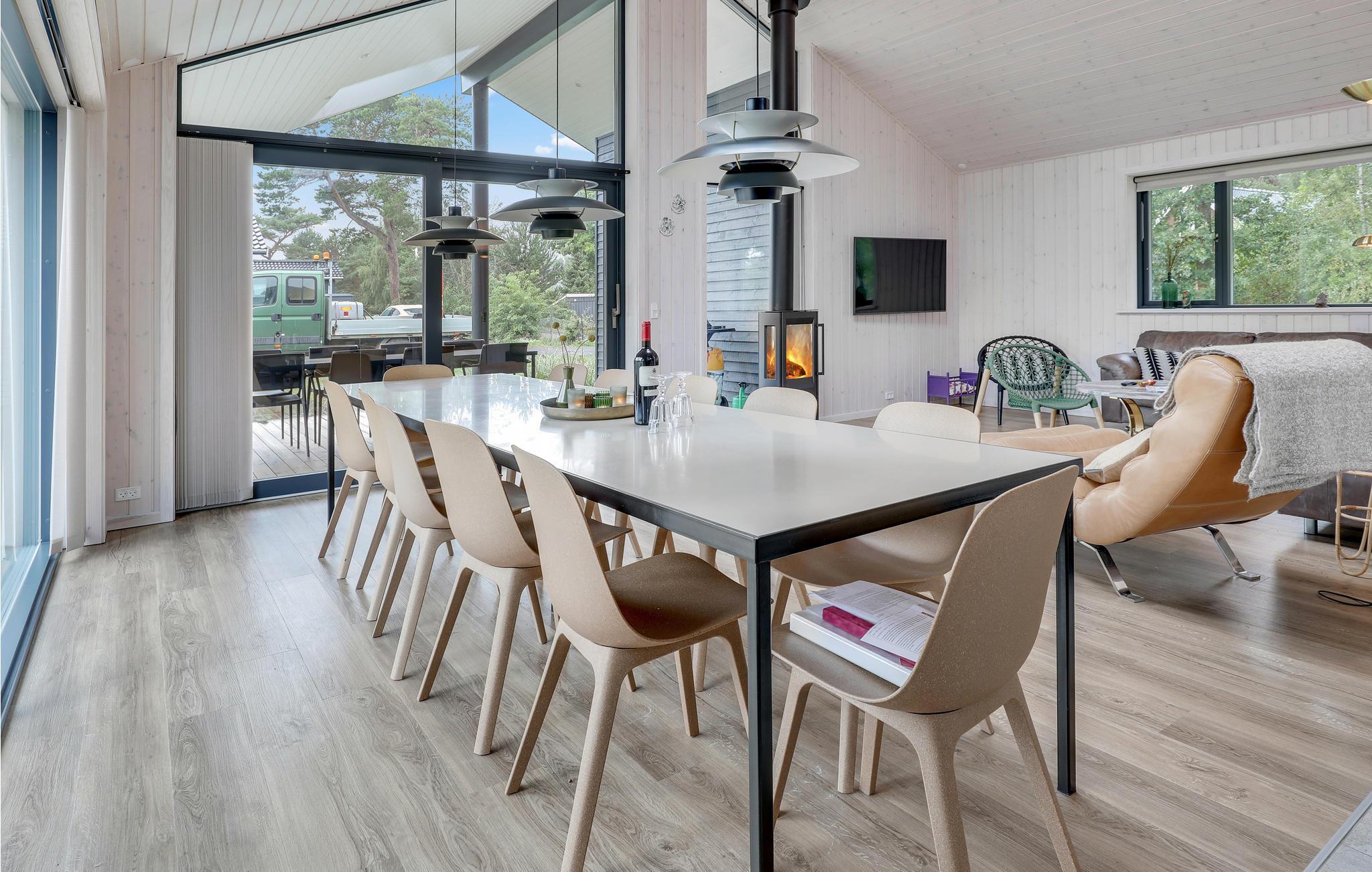 Her får I et sommerhus i topklasse og med plads til mange gæster. Åbent til kip i kombination med store vinduer gør huset ekstremt rummeligt og lyst. Interiøret er moderne, og gulvvarme i hele huset sikrer et behageligt indeklima. Opholdsstuen er husets naturlige mødested. Her kan I slænge jer i komfortable møbler, mens I ser film på fladskærmen, og om vinteren spreder brændeovnen varme og skaber en hyggelig atmosfære. I det store, åbne og meget veludstyrede køkken er det en fest at tilberede lækre feriemåltider, for her kan mange gæster være i gang samtidigt. Af de fire gode soveværelser er et af dem udstyret med TV, så dem der sover i dette får fornøjelsen af at kunne se fjernsyn fra under dynen. Huset har også en stor hems med to sovepladser samt to badeværelser. I bryggerset finder I en fryser, vaskemaskine og en tørretumbler. Huset har energivenligt varmepumpe-system og lademulighed til el-biler.