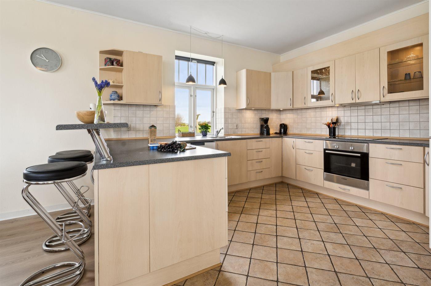 Køkkenet er udstyret med 1 køleskab. Der er 4 keramiske kogeplader, varmluftovn, mikrobølgeovn samt opvaskemaskine Der er gulvvarme i køkkenet.