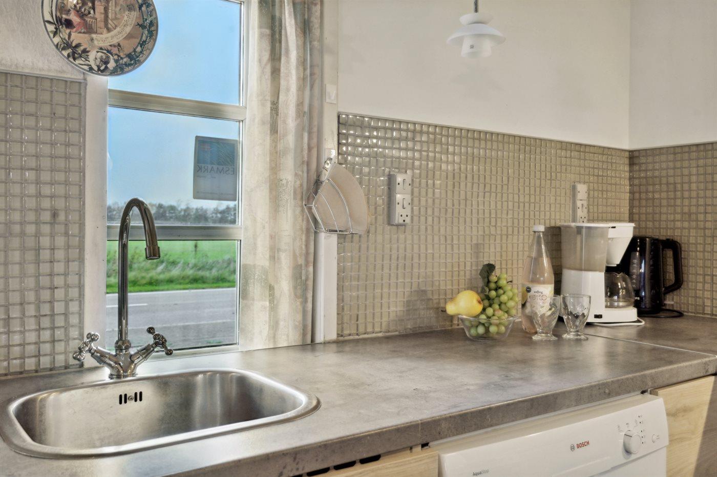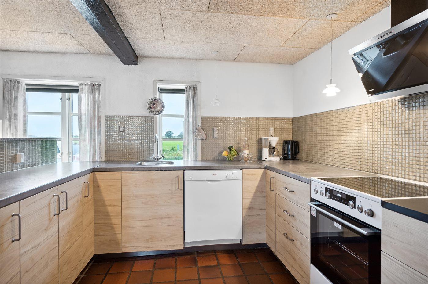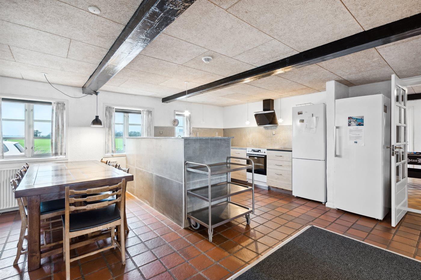 Køkkenet er udstyret med 2 køleskabe. Der er 4 elkogeplader, varmluftovn samt opvaskemaskine.