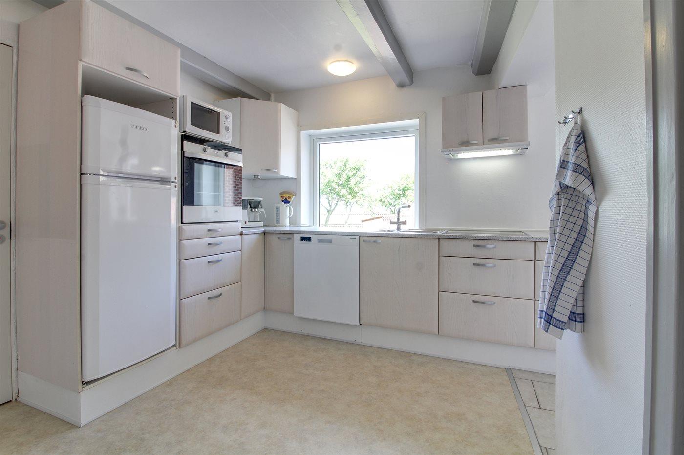 Køkkenet er udstyret med 1 køleskab. Der er 4 keramiske kogeplader, varmluftovn, mikrobølgeovn samt opvaskemaskine Der er gulvvarme i køkkenet.
