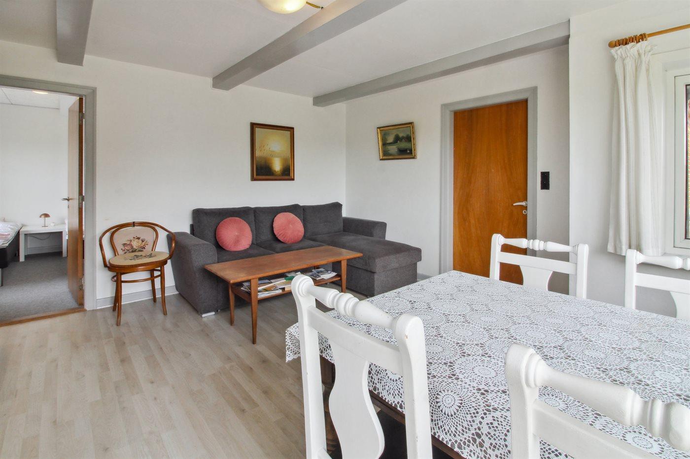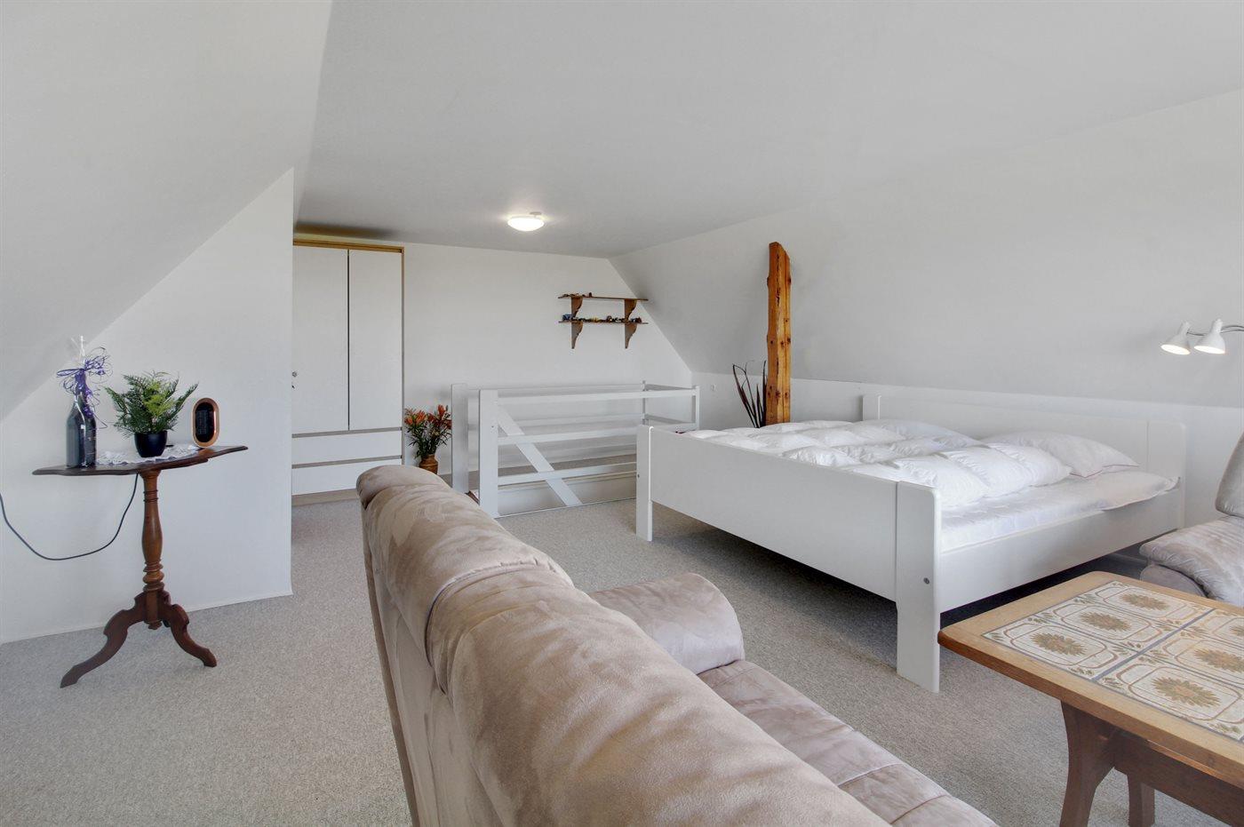 Der er i alt 1 soveværelse. Sovepladserne fordeler sig på: 2 sovepladser i dobbeltseng. 2 sovepladser i enkeltsenge. 2 sovepladser i sovesofa (dobbelt). 2 af disse sovepladser befinder sig i stuen. Derudover er der 1 stk. barneseng.