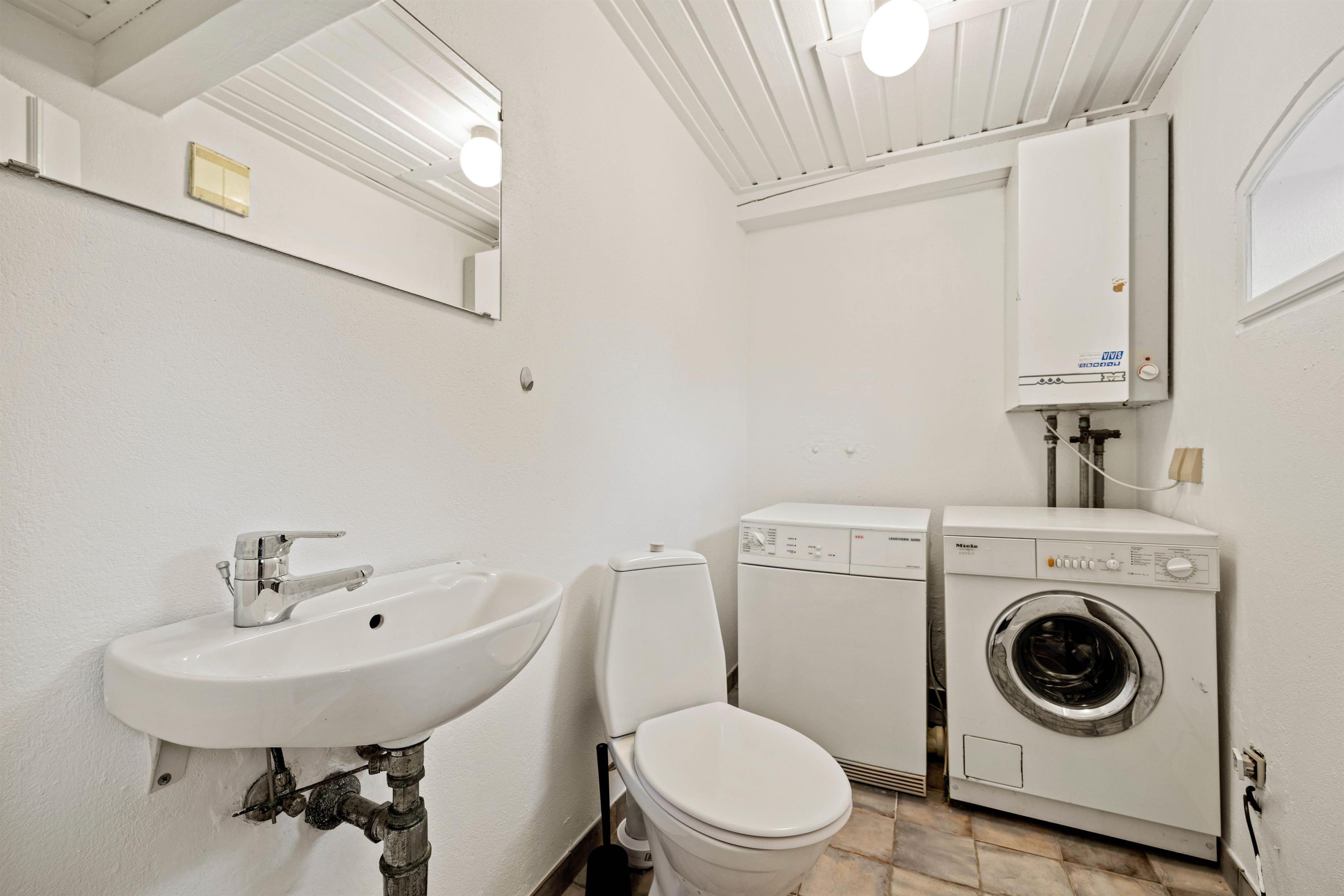 Feriehuset har et fint badeværelse med bruser samt et gæstetoilet, så køen ikke bliver for lang om morgenen. Der er både vaskemaskine og tørretumbler i sommerhuset.
