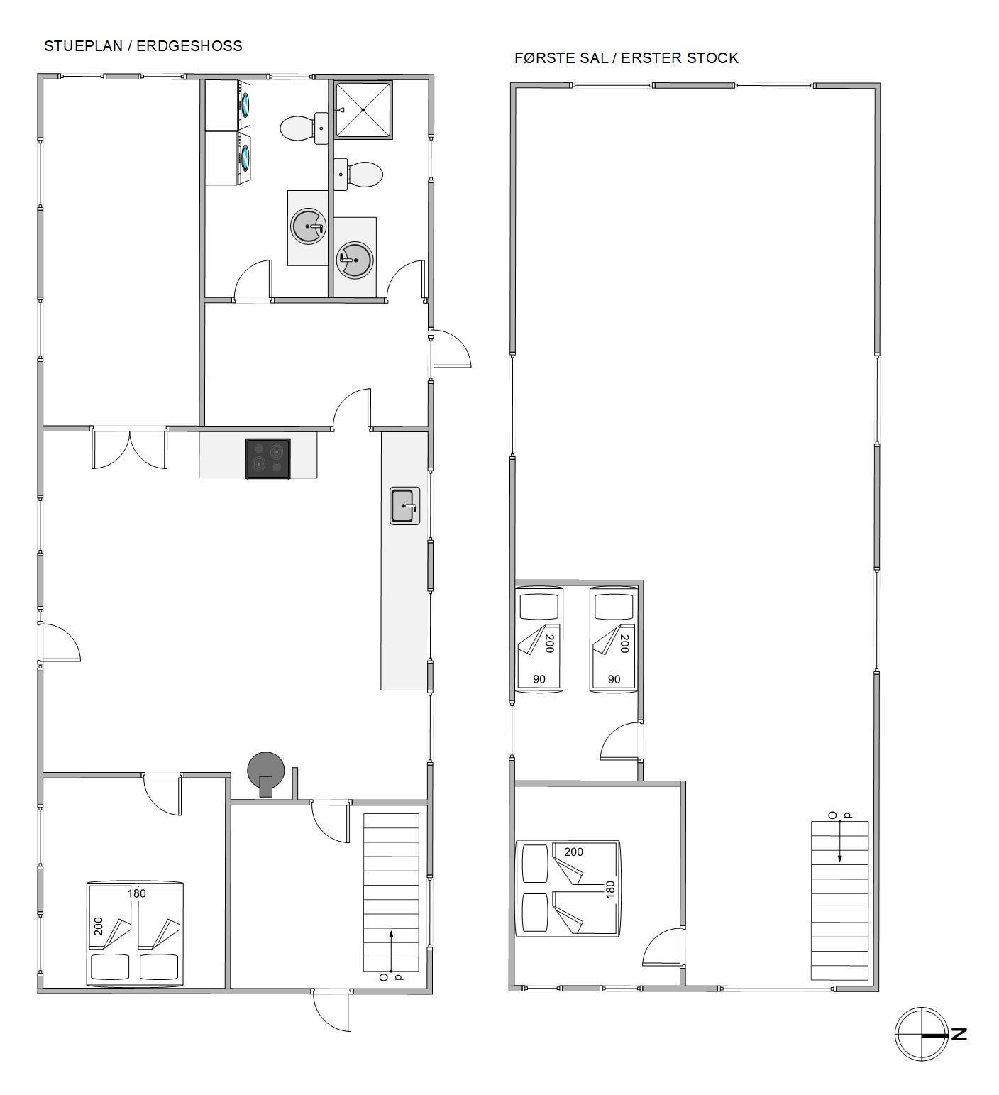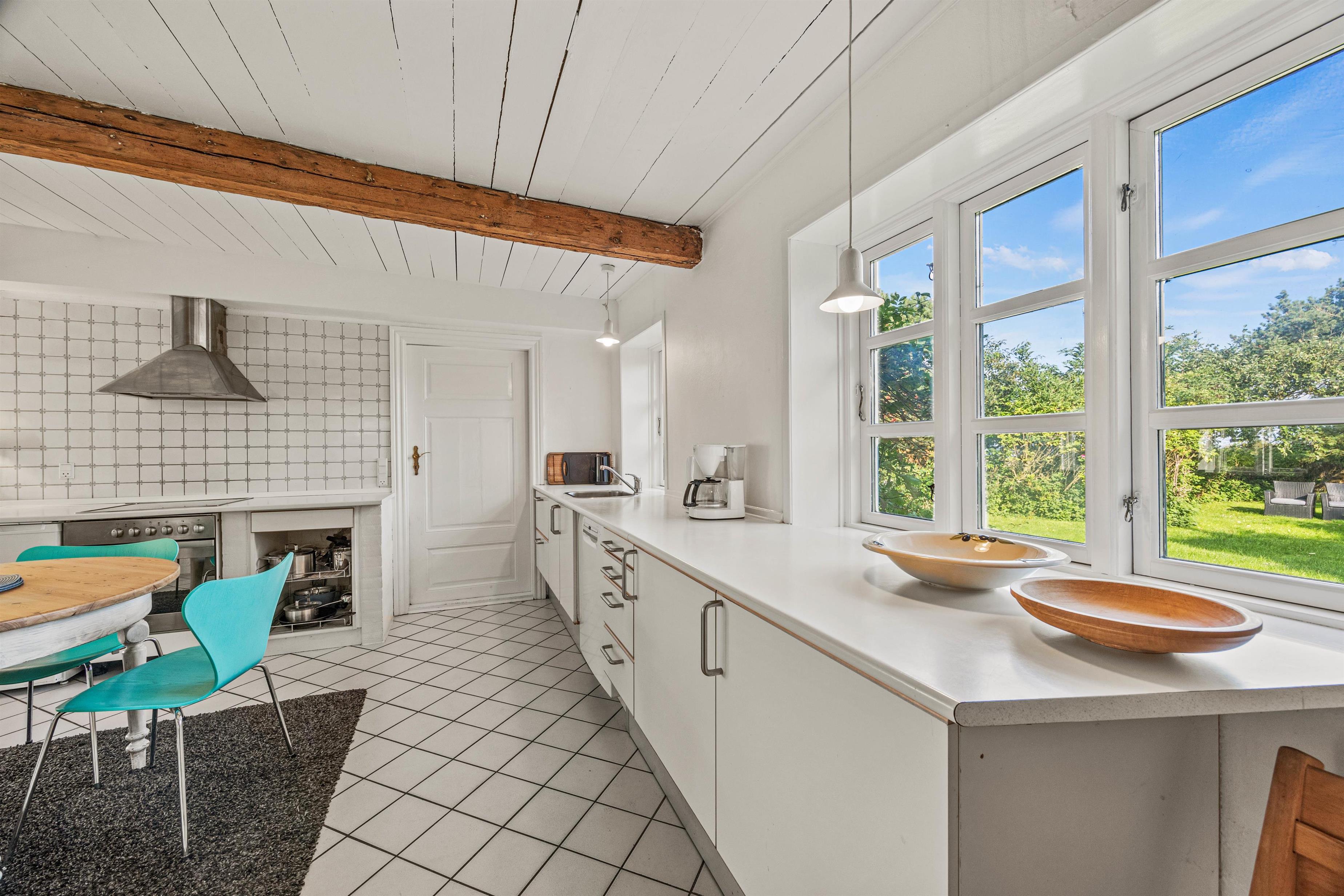 Hjerterummet i feriehuset finder I i stueetagen. Her er køkken og stue forbundet i ét, og brændeovnen skaber en ekstra hyggelig feriestemning og bidrager til den gode atmosfære. Køkkenet er rummeligt og indrettet med fryser og opvaskemaskine, så I ikke selv skal stå med opvasken efter madlavningen.