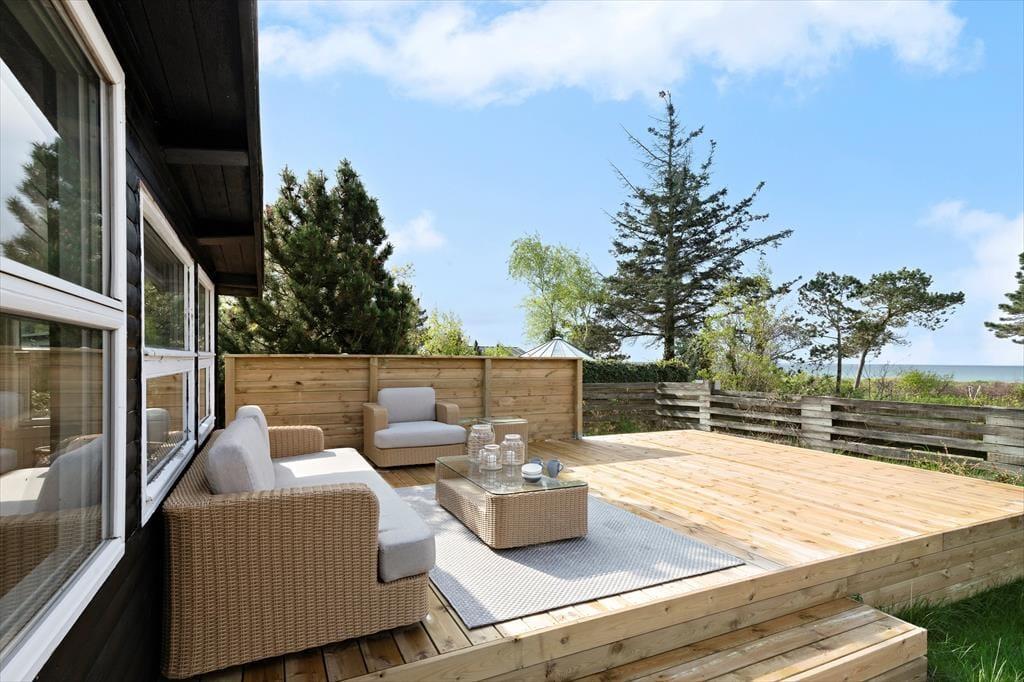 Huset er beliggende på en dejlig stor naturgrund med træterrasse og fantastisk havudsigt. Velegnet til leg og udendørsaktiviteter. Til huset hører skønne træterrasser med havemøbler, liggestole og grill. Hvis du er tidligt oppe, kan du opleve naturens egne dyr som går rundt og græsser. Havet kan du også høre fra terrassen så du skal bare slå dig ned og nyde det hele i fulde drag. Du kan også tage en morgendukkert på 2 minutter er du nede ved vandet og kan tage et opfriskende bad. Solen er på husets vand siden hele dagen, når den er fremme forstås. De øvrige dage er området egnet til lange gåture.
