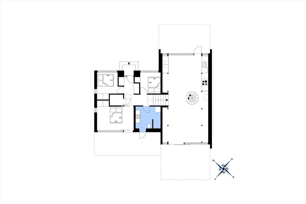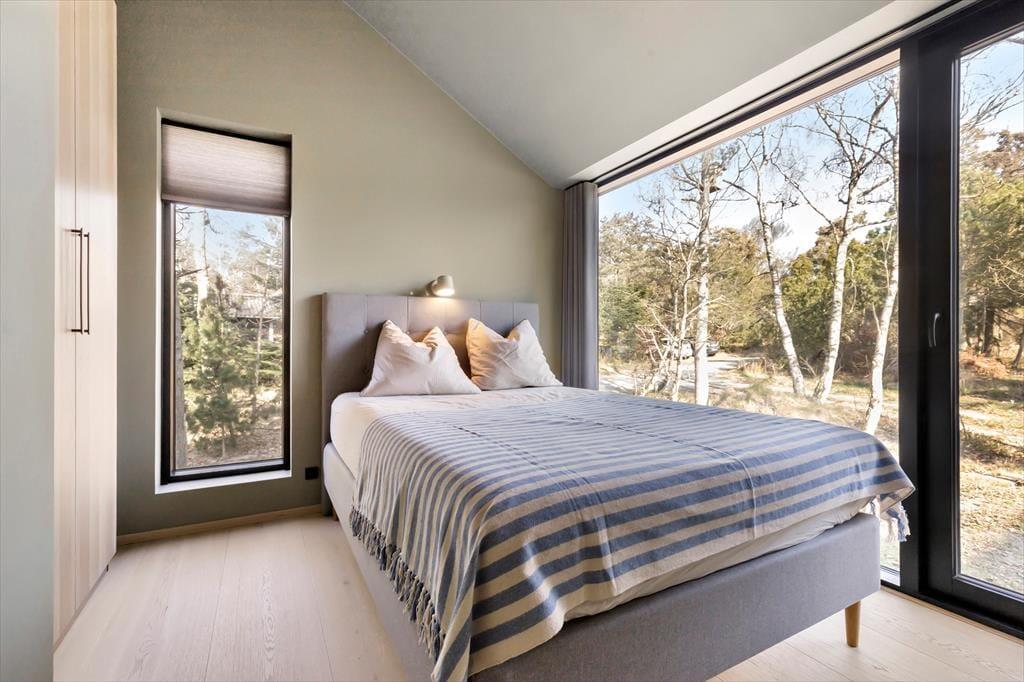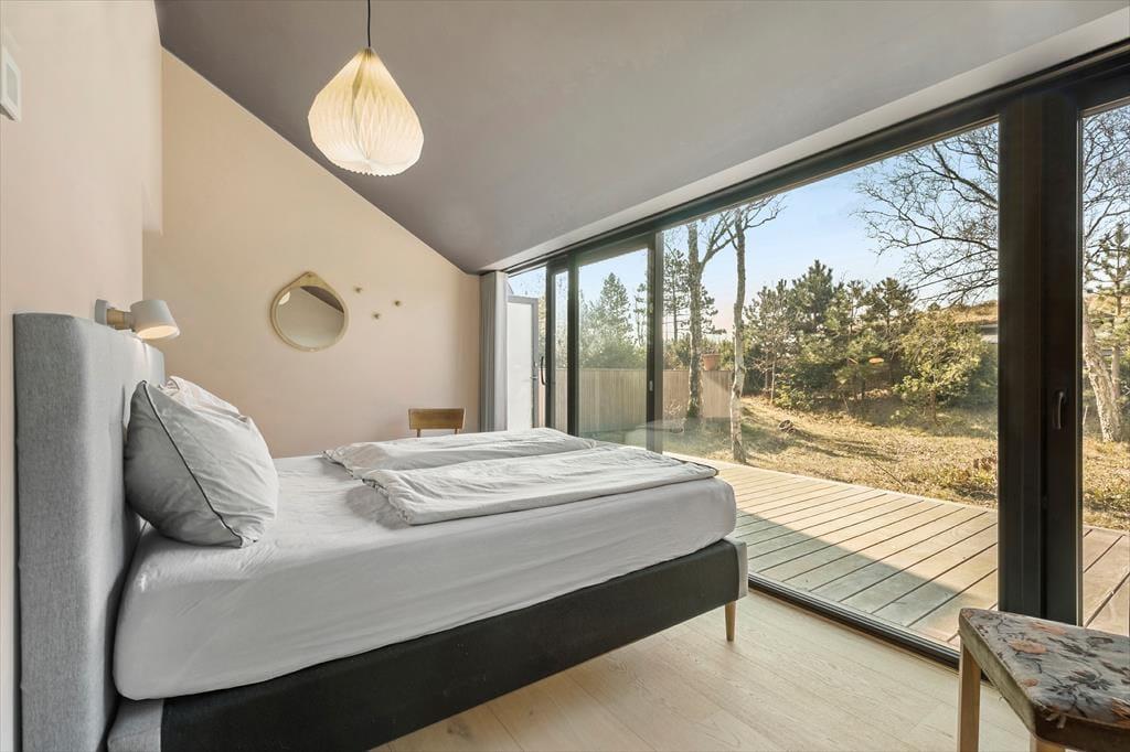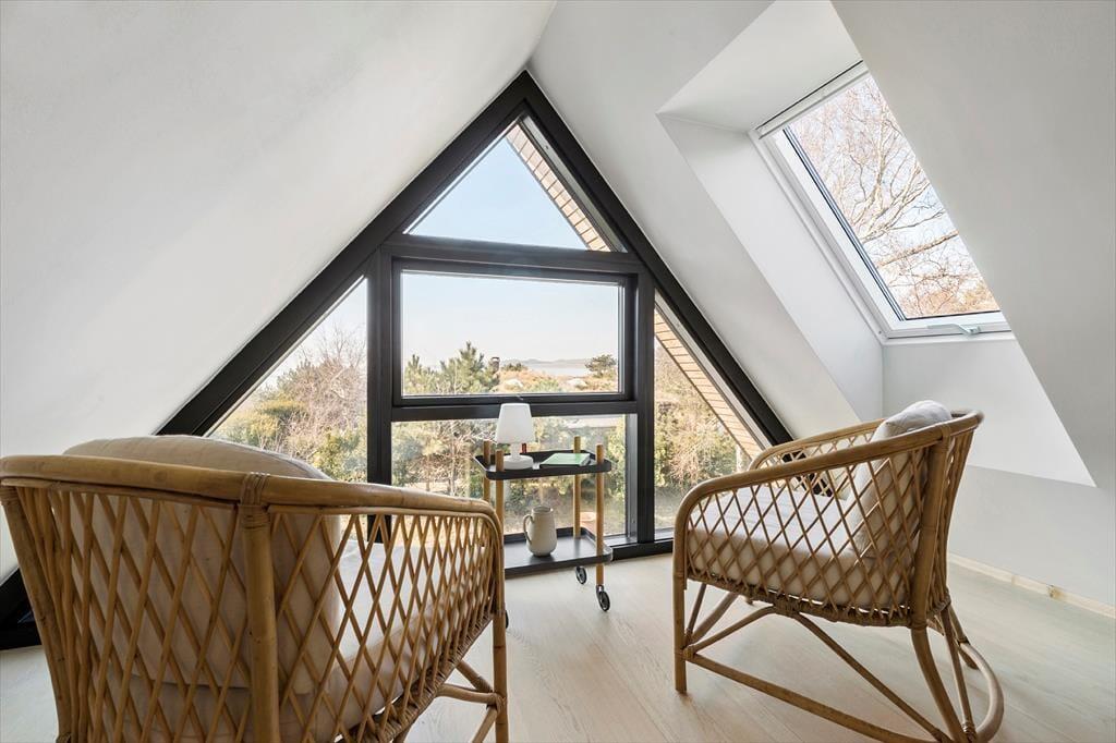 Huset har tre soveværelser med dobbeltsenge og plads til i alt seks voksne og ét barn. På 1. salen venter en hyggelig krog med panoramaudsigt – perfekt til afslapning med en god bog. Badeværelset er rummeligt og indeholder bruseniche, vaskemaskine og tørretumbler, samt adgang til endnu en sydvendt terrasse, hvor du finder en udendørs bruser – ideel til et frisk bad efter en tur på stranden.