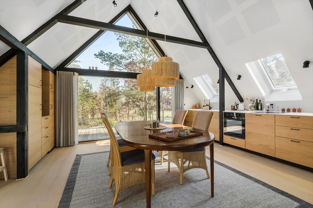 Huset rummer et nyt køkken (med opvaskemaskine) og en hyggelig spiseplads. Fra køkkenet har du direkte adgang til nord-øst terrasse med udsigt til skoven, hvor egern hopper rundt, og rådyr af og til kigger forbi. Stuen er åben og lys med store vinduer og adgang til endnu en sydlig terrasse, hvor du kan lytte til fuglene eller nyde synet af børnene, der leger på naturgrunden.