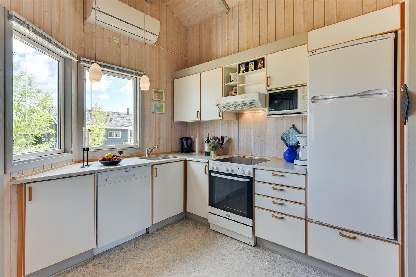 Køkkenet er udstyret med 1 køleskab. Der er 4 keramiske kogeplader, varmluftovn, mikrobølgeovn samt opvaskemaskine.
