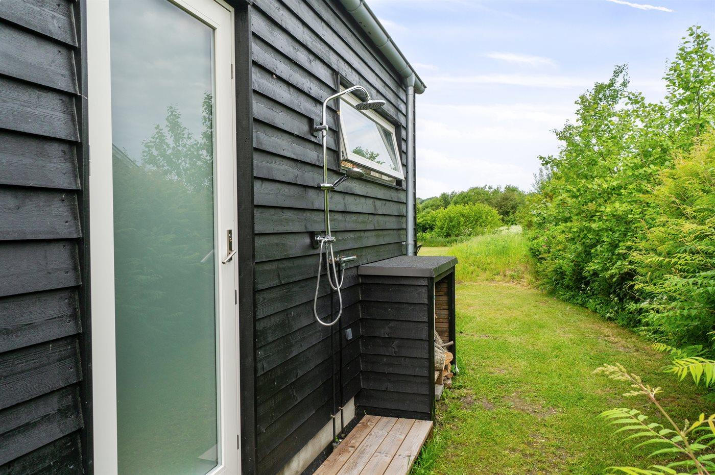 Ferieboligen er beliggende på en 1050 m² stor naturgrund. Der er 150 m til havet. Nærmeste forretning er beliggende i en afstand af 4000 m. Til ferieboligen hører åbent terrasseareal. Desuden er der overdækket terrasse. Der er redskabsrum. Udendørs bruser. Parkering ved ferieboligen.