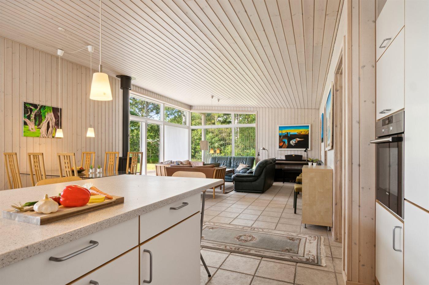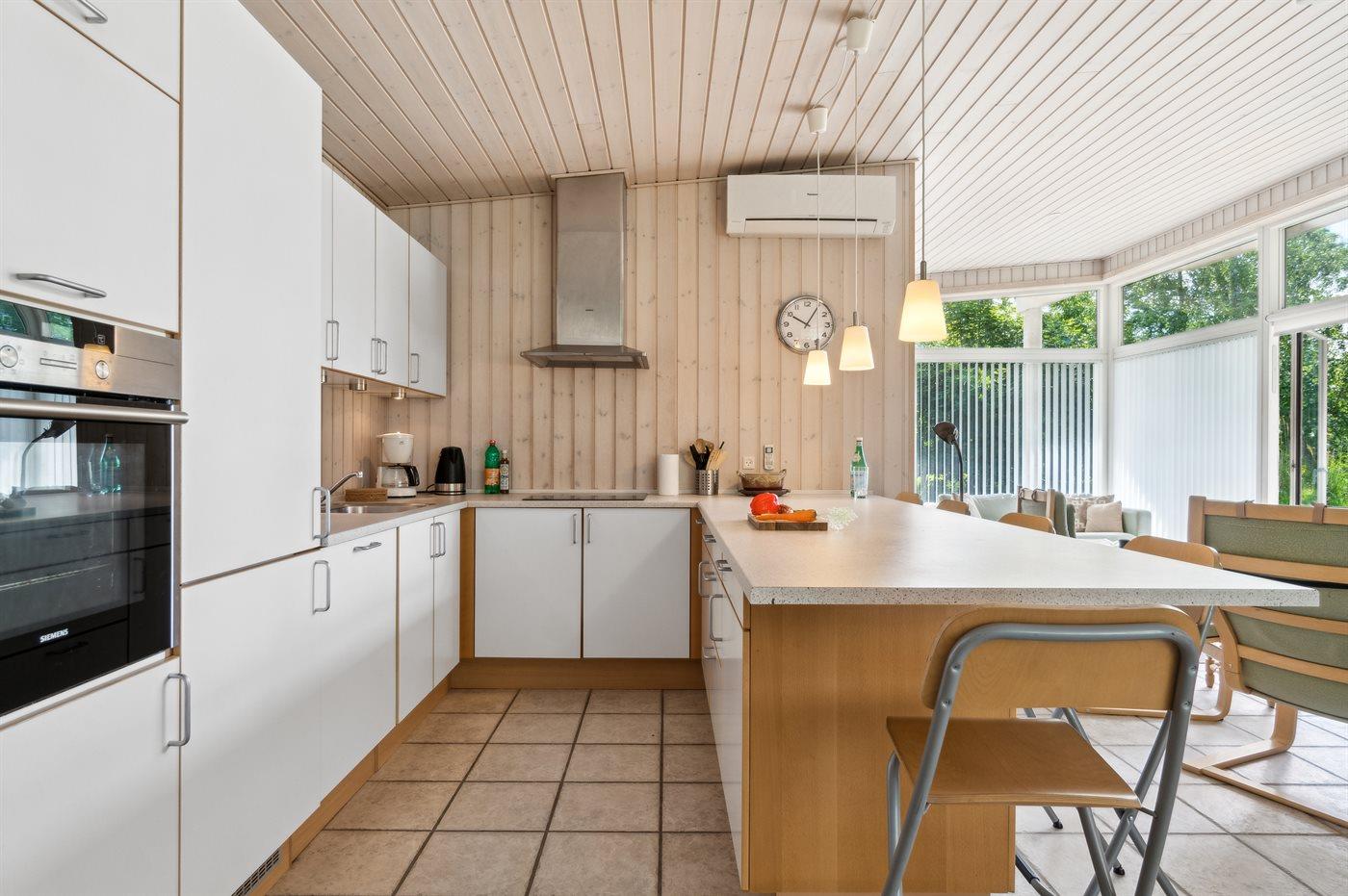 Køkkenet er udstyret med 1 køleskab. Der er 4 induktionskogeplader, varmluftovn, mikrobølgeovn samt opvaskemaskine.