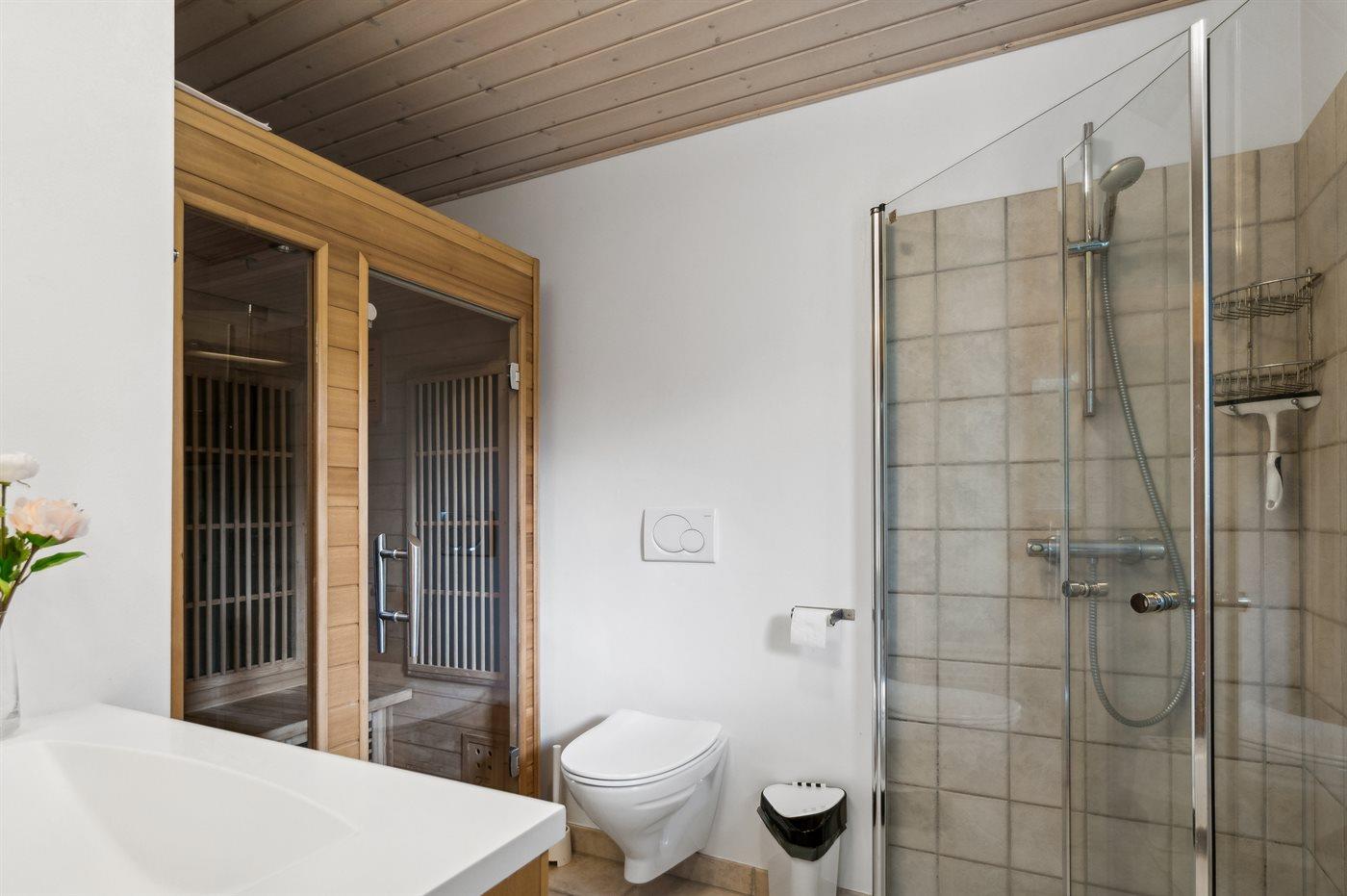 Der er 2 badeværelser med bruseniche og 2 toiletter. Der er gulvvarme på 2 badeværelser. I saunaen er der mulighed for afslapning.