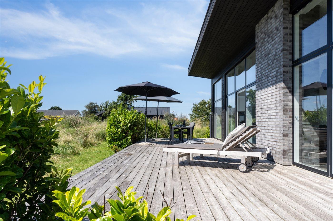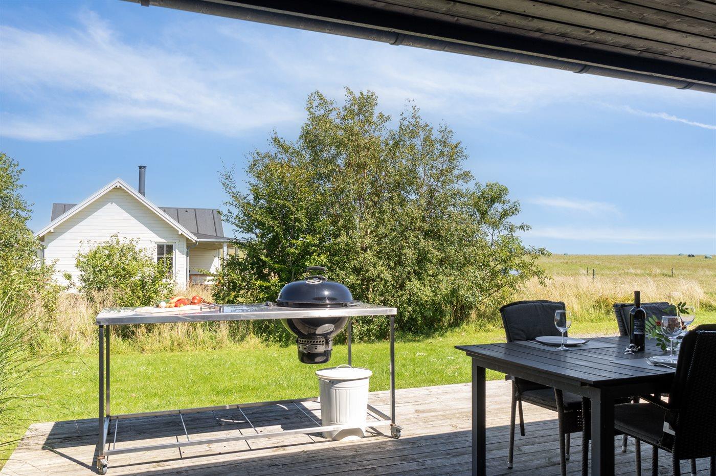 Sommerhuset har et fantastisk og delvist overdækket terrasseareal – her er det ofte muligt at finde et hjørne med læ, hvor man kan sidde og nyde solen. Fra terrassen er der et rigtig godt udsyn over haven, hvor der bl.a. findes en stor trampolin, som børnene kan hygge sig på imens de voksne nyder en kop kaffe eller et glas vin.