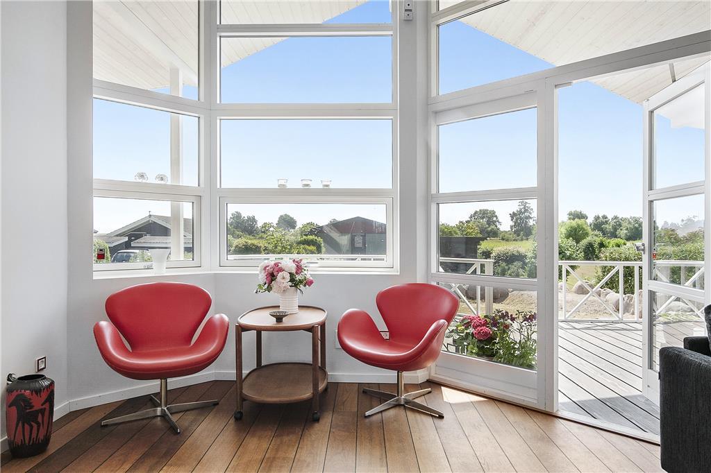 Huset er højt beliggende på en 539 m2 grund med en flot udsigt ud over vandet. Udover en delvis overdækket træterrasse foran huset er der en stor afskærmet solgård, hvor der en markise som kan overdække den. Ved huset er der havemøbler, liggestole, parasol og grill.