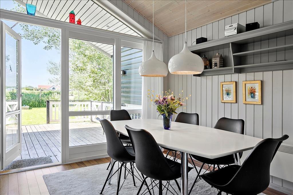 Feriehuset som er fra 2008 er indrettet med kombineret køkken og opholdsstue. Lyst køkken med indbygget ovn, kogeplader, køleskab med fryser, mikroovn og opvaskemaskine. Opholdsstue med udgang til delvis overdækket terrasse og med et stort lysindfald fra vinduespartierne. Loft til kip. To sofaer og TV med Waoo lille TV-pakke. Badeværelse med sorte gulvklinker og hvide elementer, bruseniche og gulvvarme. Entre med vaskemaskine med integreret tørretumbler. Tre soveværelser, to med dobbeltsenge og et med køjeseng. Fra to af soveværelserne er der havedør ud til terrassen. Huset opvarmes med varmepumpe og elvarme.