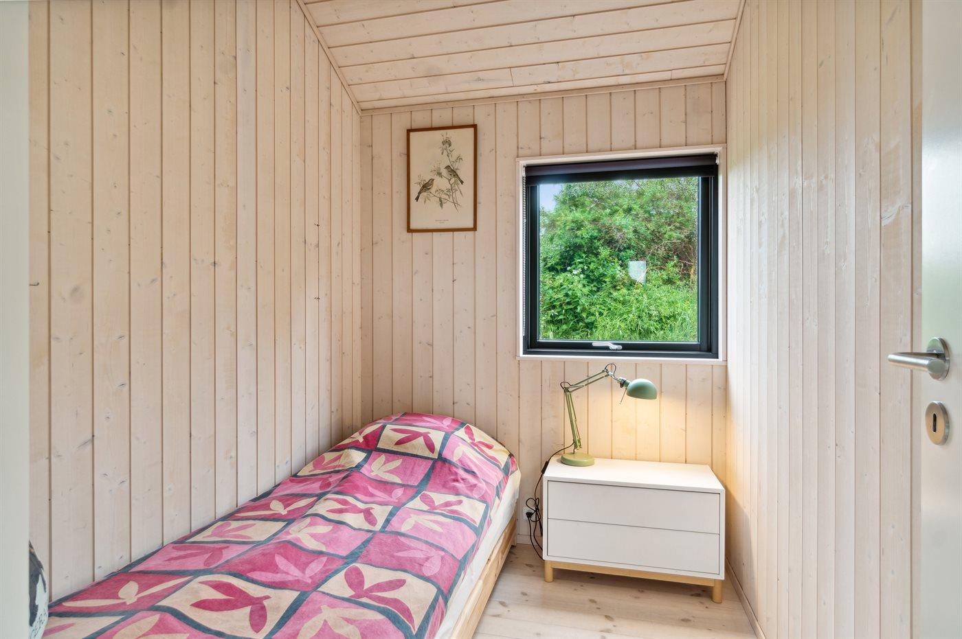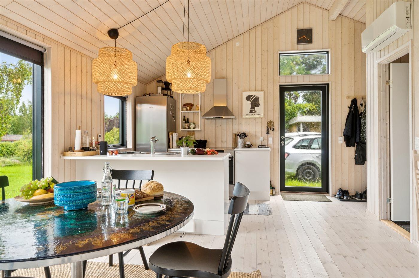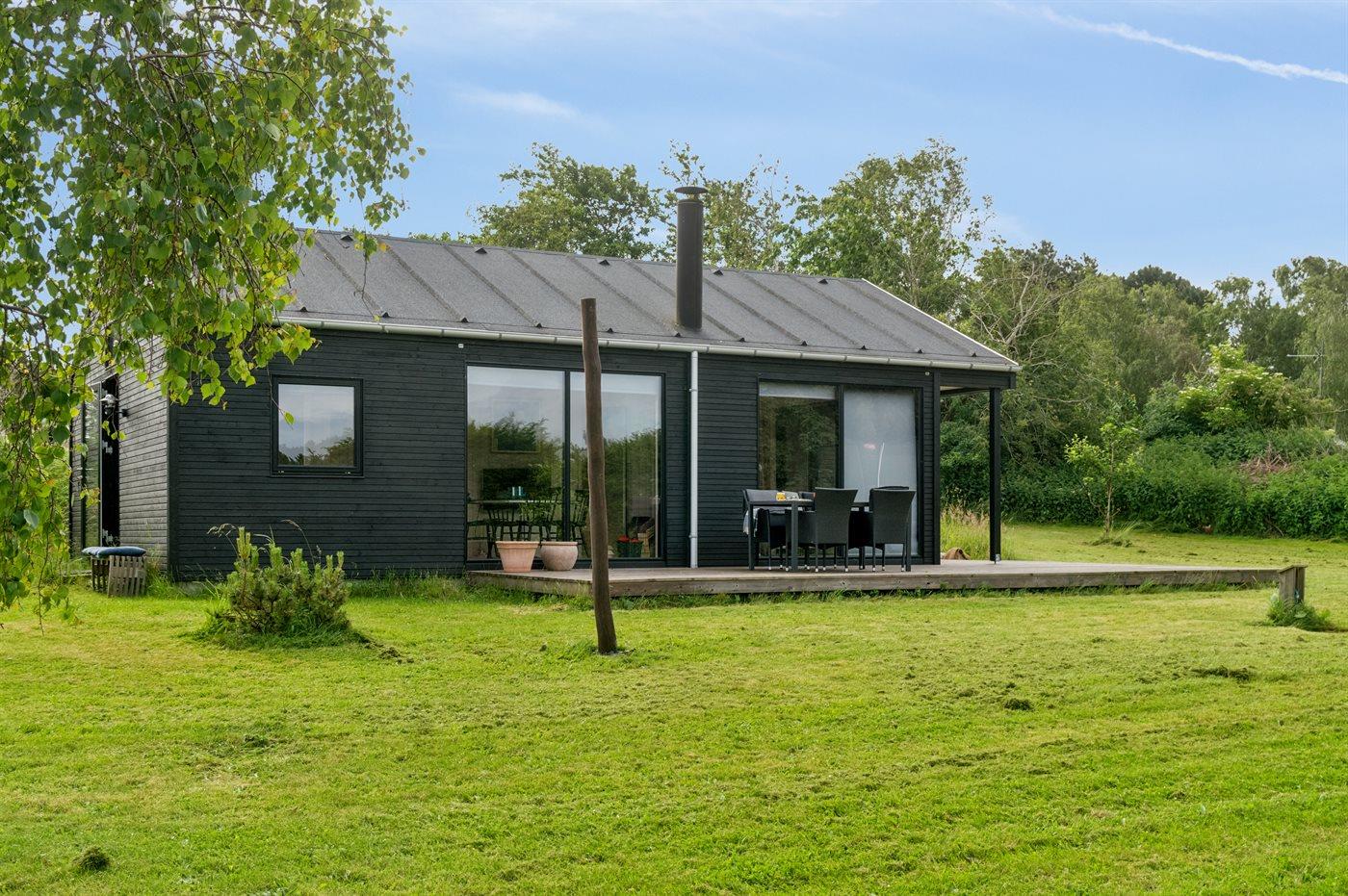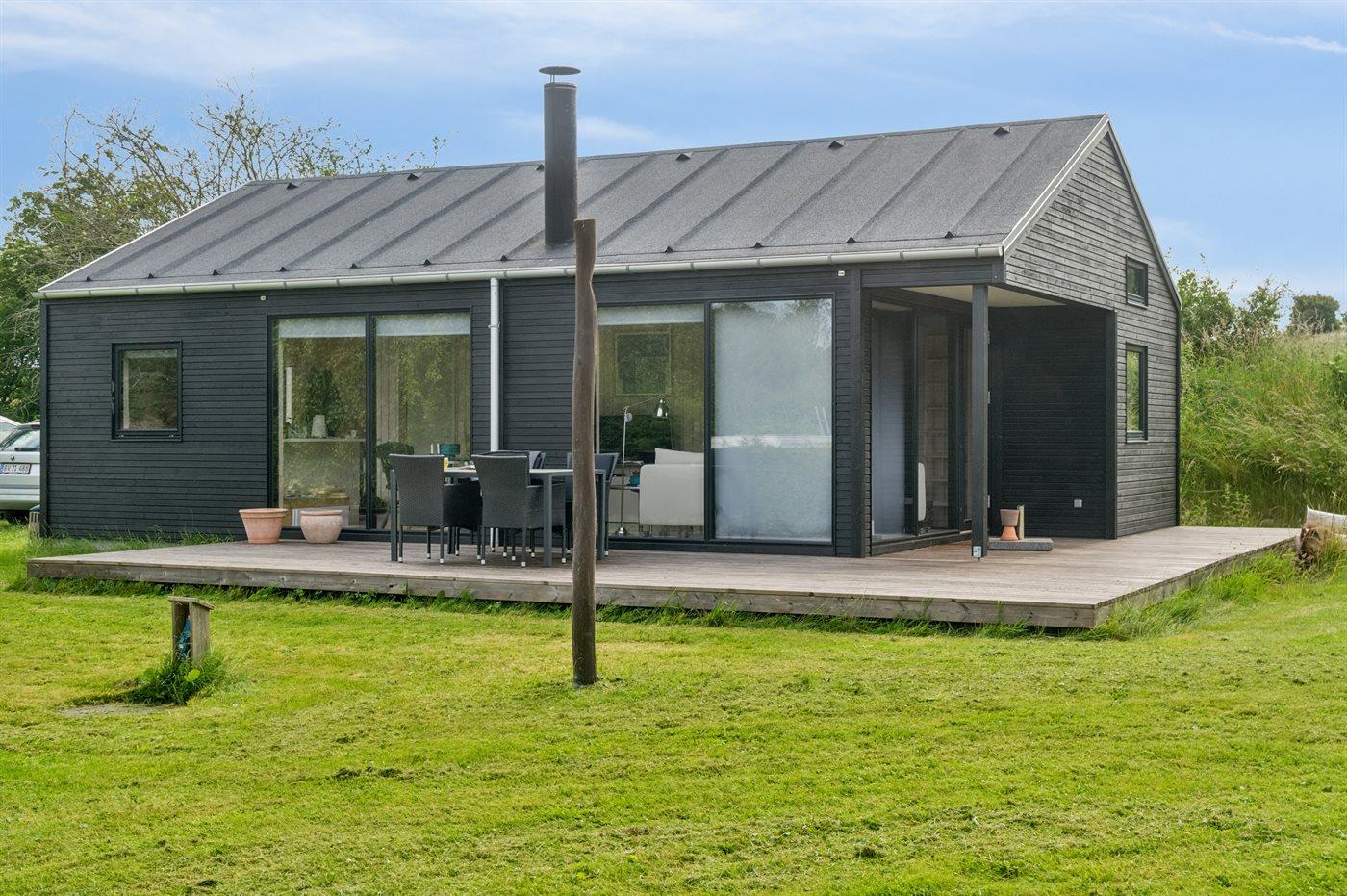 Dette moderne og flotte sommerhus fra 2017 er beliggende i et roligt sommerhusområde for enden af en blind vej. Huset ligger direkte ud til åbne marker i landlige og naturskønne omgivelser med kun 350 meter til en dejlig børnevenlig sandstrand med badebro.