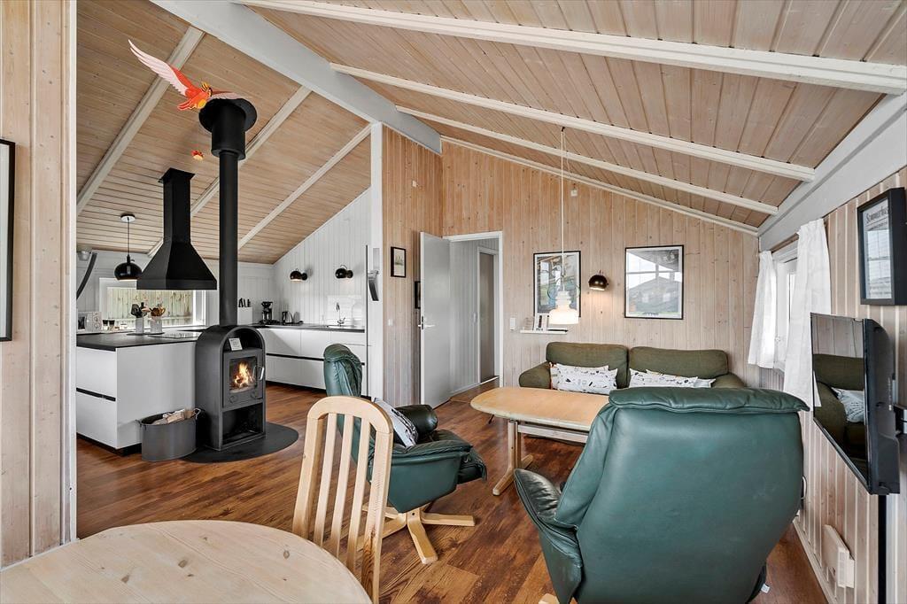Det 74 m2 store træsommerhus har en glimrende indretning til fem personer, for inden døre venter tre gode soveværelser og et badeværelse med bruser og vaskemaskine. Endelig er der stuen, som er et skønt opholdsrum med integreret køkkenafdeling, loft til kip og indfaldslys fra tre verdenshjørner. Brændeovnen står klar, hvis I vil skrue op for både varmen og hyggestemningen, og fladskærms-tv’et med Chromecast kan levere underholdningen til de aftener, hvor I bare trænger til at slappe af i sofaen. Når der skal laves mad, får I gode arbejdsforhold i det moderne og veludstyrede køkken, der er et glimrende eksempel på husets pæne stand efter seneste renovering i 2019.