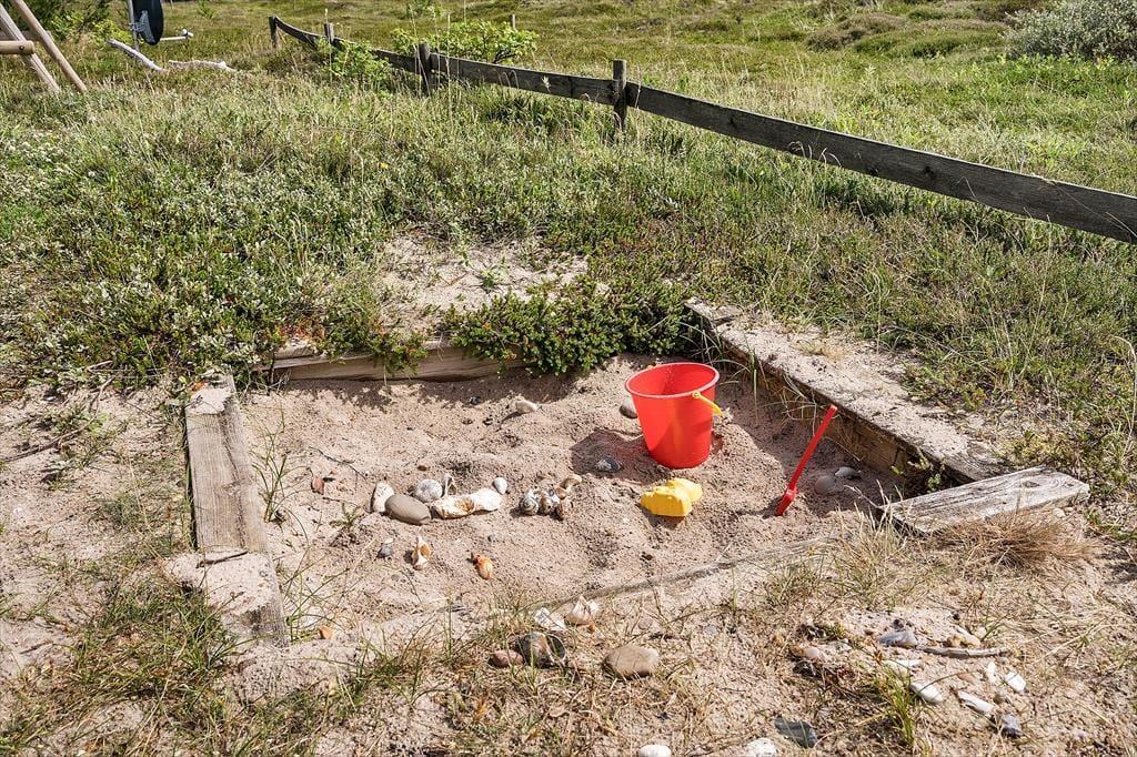 Fra stuen har I direkte adgang til et overdækket areal, der ligger som del af sommerhusets store og godt afskærmede terrasse. Den kan lukkes af med havelåger i begge ender, så hvis I har små børn eller hunden med på ferie, får de en tryg ramme om det udendørs driverliv. Til børnene er der for øvrigt både sandkasse og gyngestativ på naturgrunden, og der er også et bord-bænke-sæt, hvor I kan hygge jer med eftermiddagskaffen.