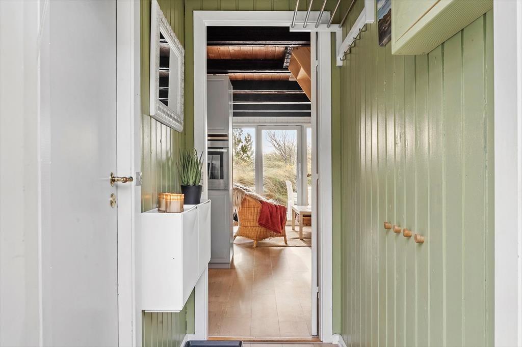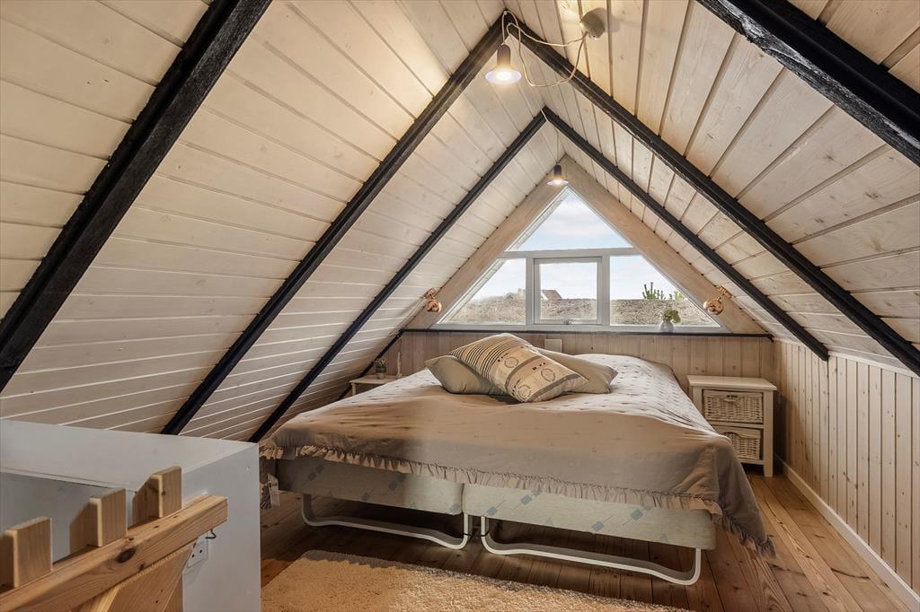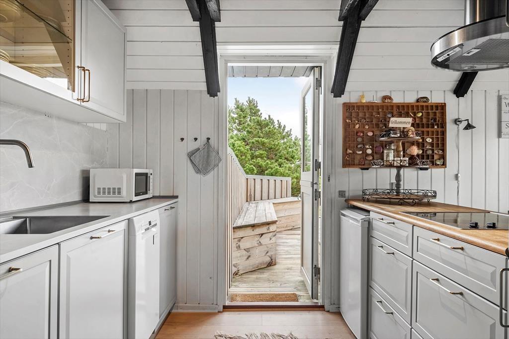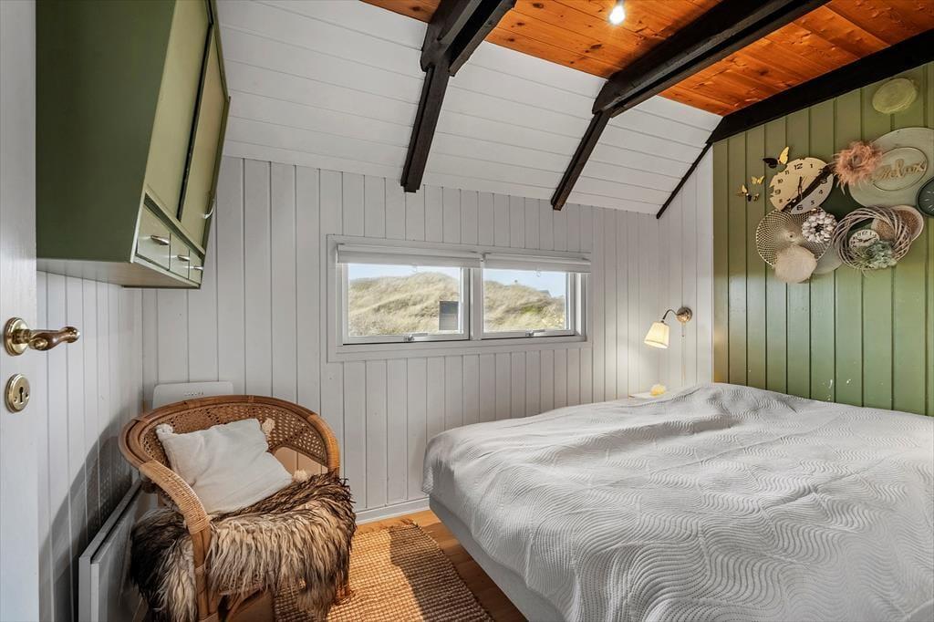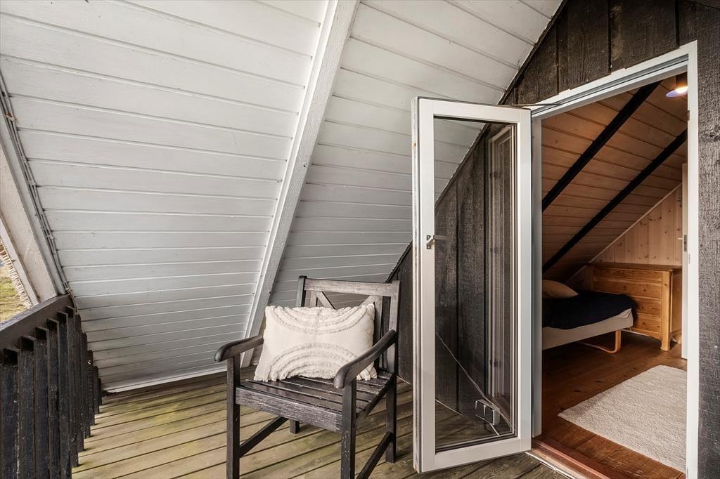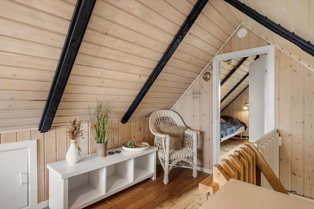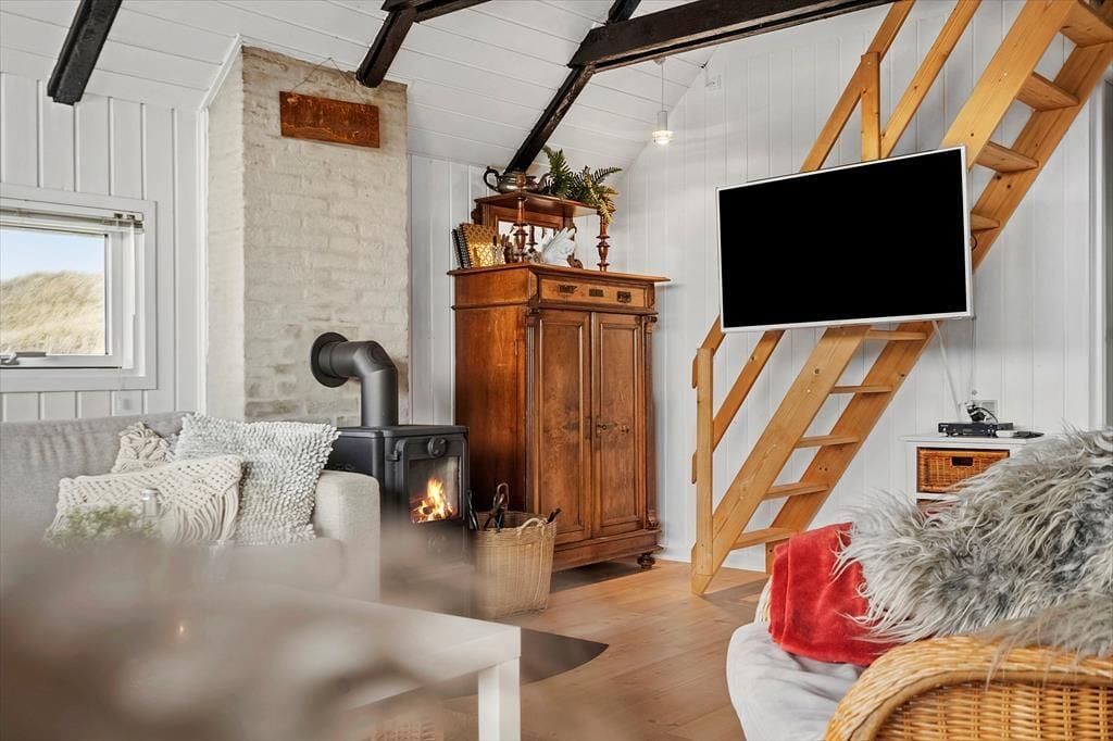 Når I træder indenfor i sommerhuset på Nymandsbjerg 10, mødes I af en lys og venlig atmosfære med synlige bjælker og et strejf af ægte sommerhussjæl. I stuen kan I samles i sofaen foran brændeovnen, mens flammerne kaster et varmt skær ud i rummet – det perfekte sted til at nyde en kop kaffe eller en god bog efter en lang gåtur langs stranden. Det åbne køkken ligger i forlængelse af stuen, så snakken kan fortsætte, mens der tilberedes feriefavoritter. De hyggelige soveværelser byder på rolige rammer til en god nats søvn, og fra værelset på første sal kan I træde direkte ud på den overdækkede balkon og nyde den friske Vesterhavsluft. Vi synes især, at netop denne lille detalje gør huset ekstra stemningsfuldt – den perfekte morgenplads med udsigt over klitterne og naturen omkring jer.