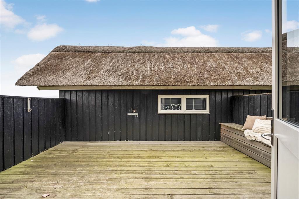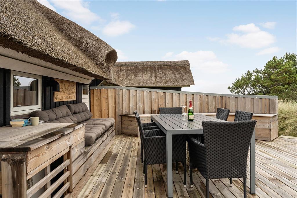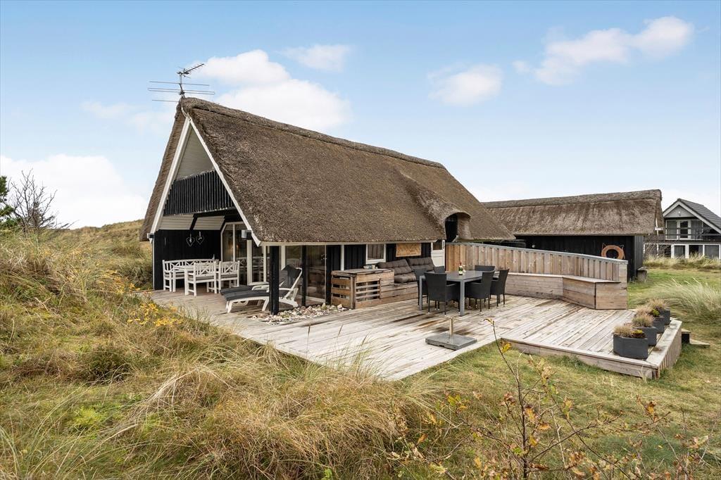 Omkring huset venter en stor, naturpræget grund med marehalm og lyng, hvor I kan finde læ for vinden og nyde solen dagen lang. Den store terrasse byder på både åbne og overdækkede kroge, så I altid kan finde jeres favoritplads. Her kan I nyde morgenmaden i det fri, læne jer tilbage i liggestolene eller tænde op i grillen til en hyggelig sommeraften under åben himmel. Hundens hale vil med garanti logre af glæde over de mange dufte og stier i området – og når solen går ned, kan I tage en aftentur mod havet og opleve, hvordan lyset falder over klitterne. Vi ved, at netop de stille stunder herude er noget, mange af vores gæster husker længst.