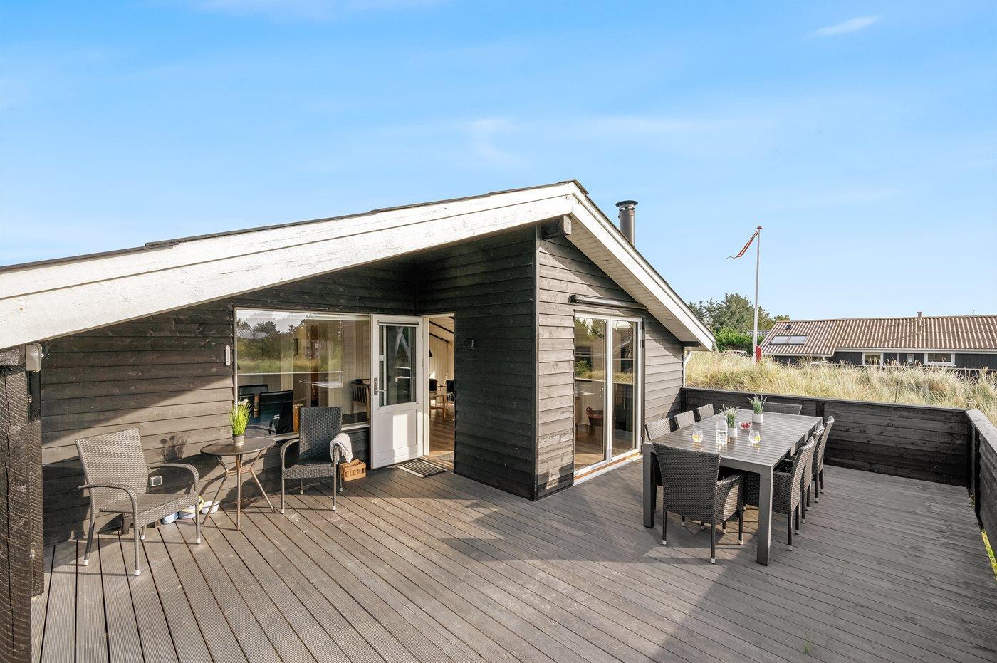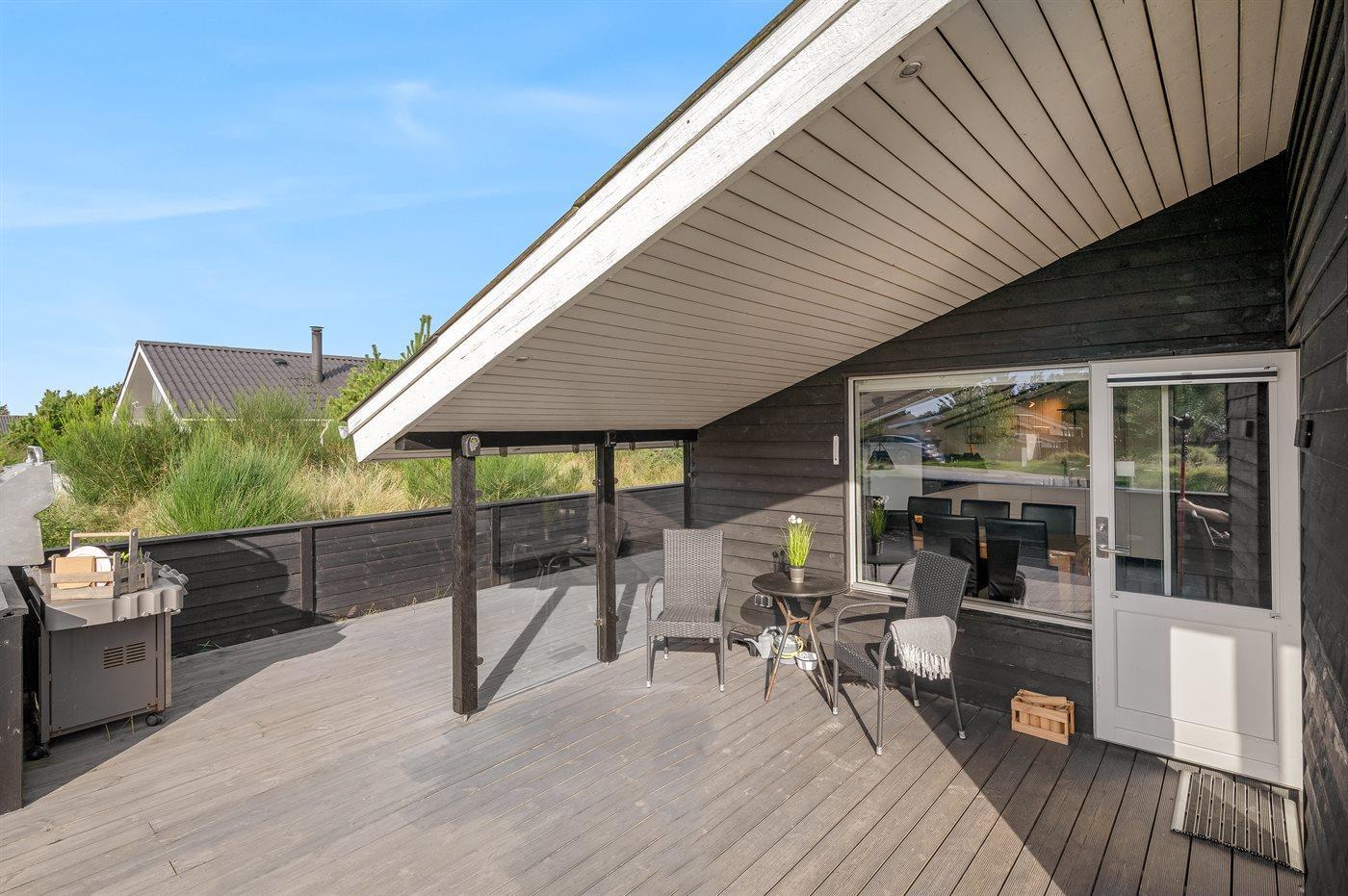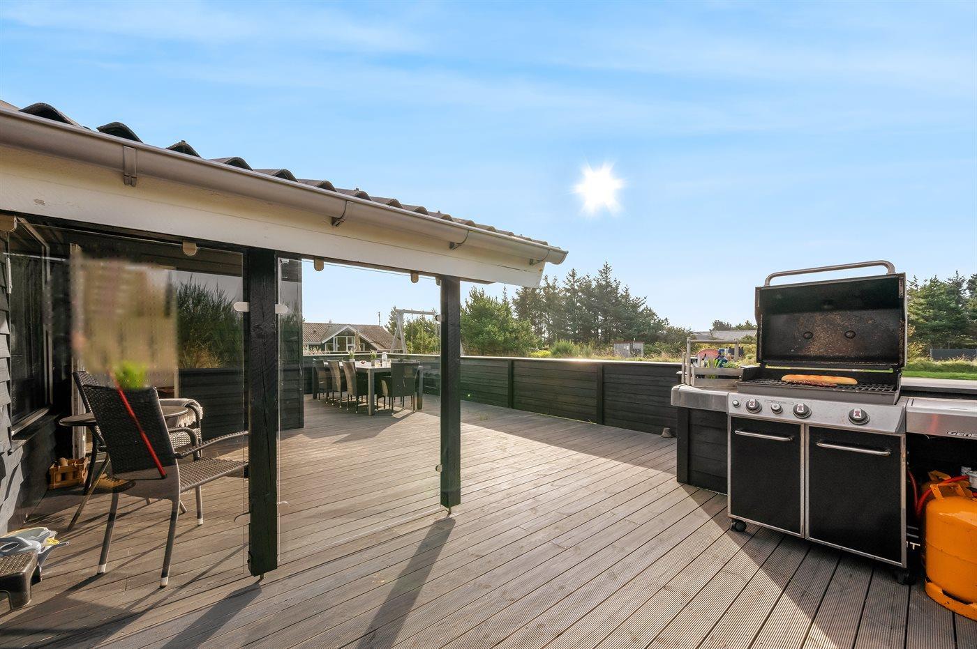 Fra stuen træder man ud på den dejlige 80 m² store lukkede terrasse, hvoraf 8 m² er overdækket. Her står en gasgrill, havemøbler og liggestole klar, så man kan udnytte de varme solskinsdage til fulde, om aftenen kan man slutte af med en lækker grillmiddag under åben himmel. Til de mindre børn er der gyngestativ. Den indhegnede terrasse har desuden en afdeling med elopvarmet vildmarksbad samt elopvarmet saunatønde med udsigt mod solnedgang over Vesterhavet.